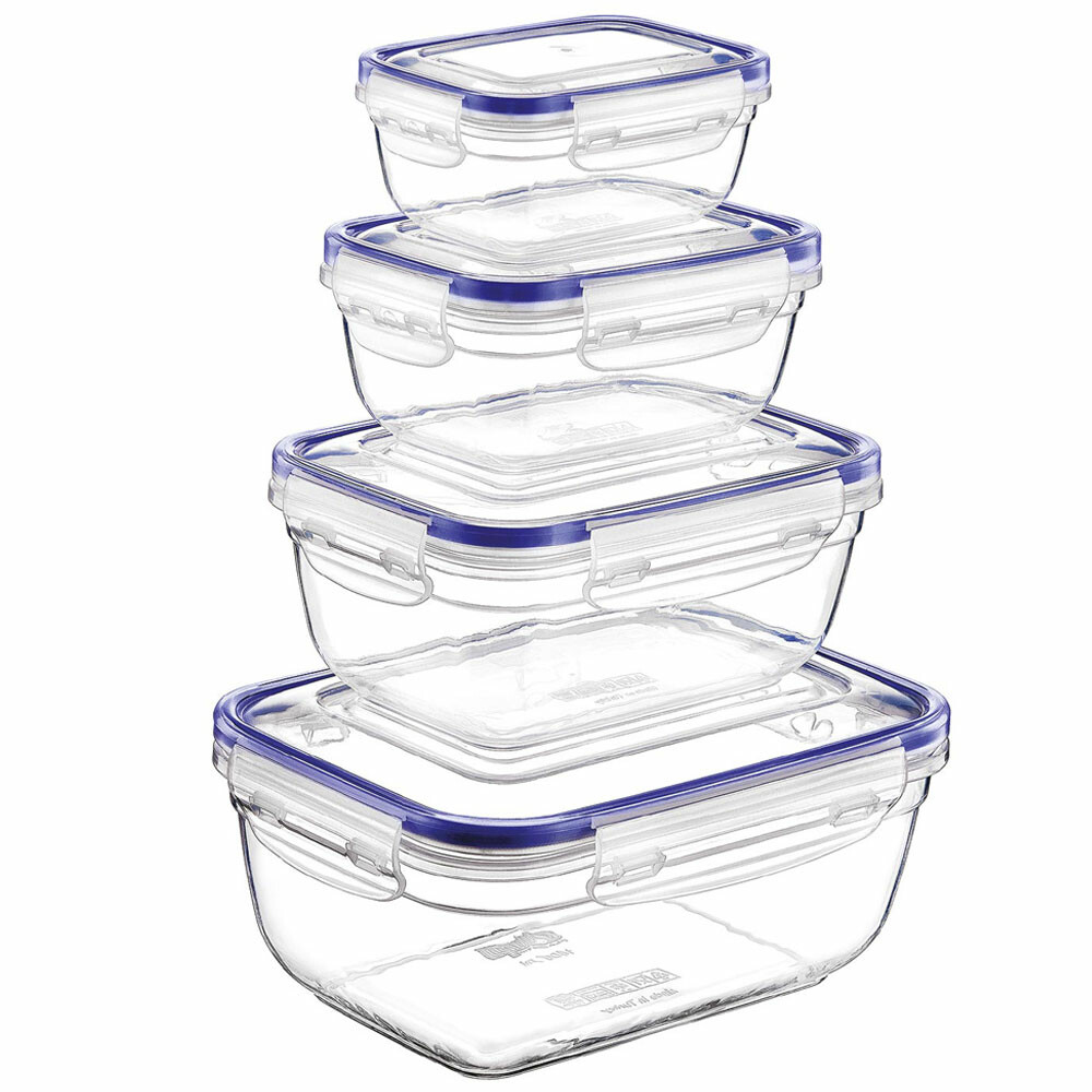 4 daļu pārtikas uzglabāšanas trauku komplekts, taisnstūrveida, 0,4 l, 0,8 l, 1,4 l, 2,3 l, 40006, Michelino. Četru caurspīdīgu trauku komplekts ar vākiem, tilpumi 0,4 l, 0,8 l, 1,4 l un 2,3 l, 100 % ūdens- un gaisa necaurlaidīgi, piemēroti lietošanai saldētavā un trauku mazgājamajā mašīnā, izgatavoti no plastmasas.