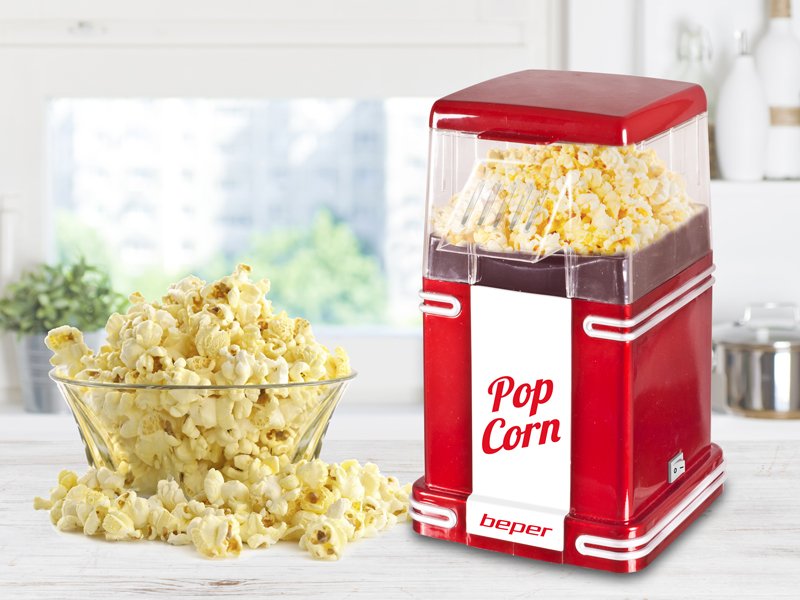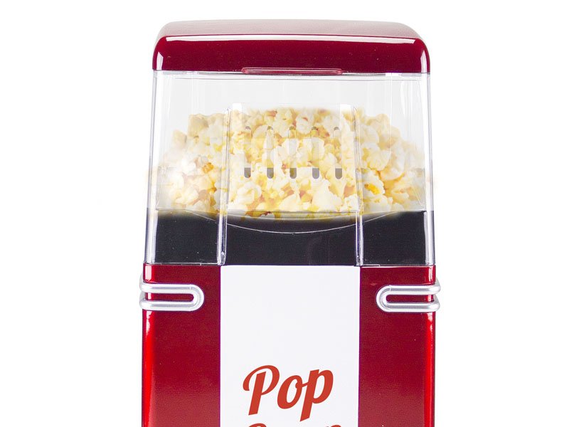 Kompakta popkorna mašīna ar ABS korpusu, kas piemērota lietošanai mājās. Pateicoties karstā gaisa cirkulācijai, tā gatavo popkornu mazāk nekā trīs minūtēs, nepievienojot taukus. Viegli lietojama, ieliekot kukurūzu grozā un gaidot, kad tās iekritīs bļodā. Ar ieslēgšanas pogu un stabilām, neslīdošām kājiņām.
