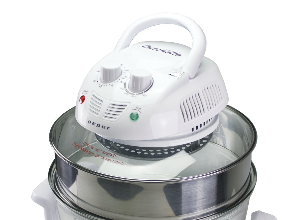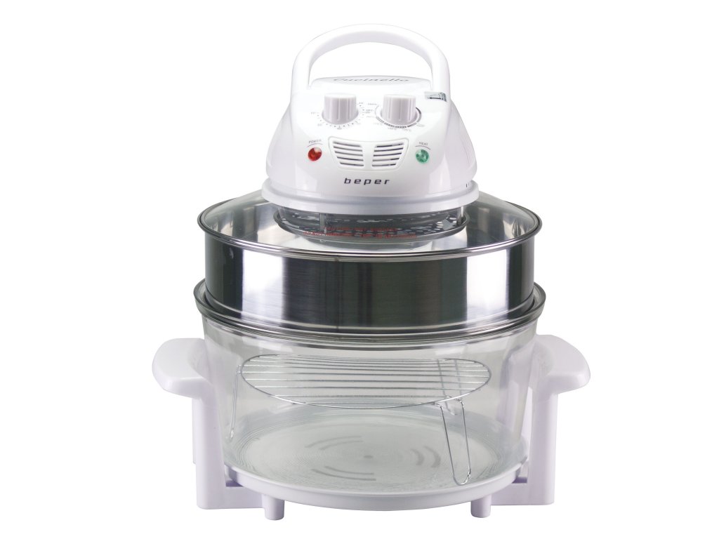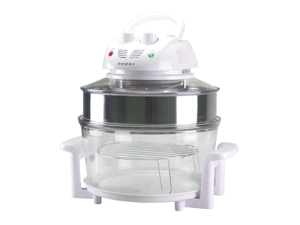 Daudzfunkcionāla cepeškrāsns ar 12L stikla trauku un tērauda paplašinājuma gredzenu, kas piemērots kopējai ietilpībai 18L. Atbalsta pamatne no ABS un stikla vāks ar pogu taimera un temperatūras iestatīšanai līdz 250°C ar sarkanu darbības gaismu un zaļu gaismu temperatūras sasniegšanai. Ventilācijas funkcija. Komplektācijā zemais režģis, augstais režģis, režģis un cepešpanna. Viegli izjaukt un tīrīt.