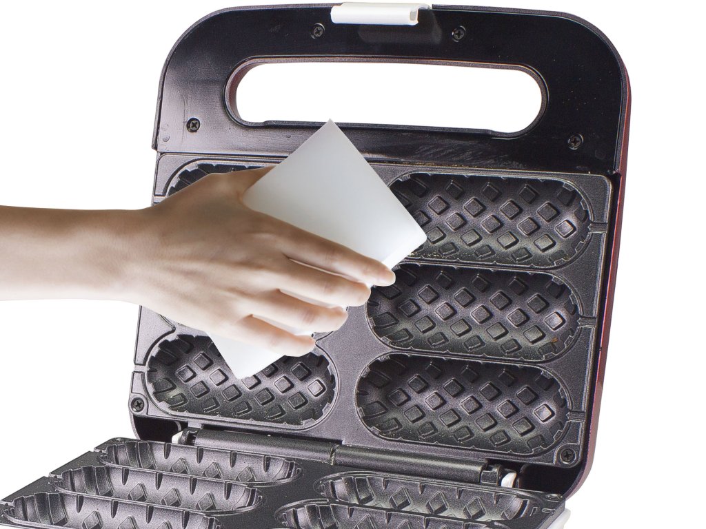 Vafeļu automāts ar nelīpošu plāksni un nekarstošu rokturi, kas vienlaikus var pagatavot līdz pat 6 nūjiņu vafelēm. Iespēja ievietot kociņus vārīšanas laikā vai pēc tā, lai nūjiņas vafeles būtu gatavas lietošanai vai rotāšanai, netīrot rokas. Aprīkots ar darbības gaismu un gatavības gaismu. Ar stabilām neslīdošām kājām un strāvas vada uztinēju. Pēc lietošanas uzglabājams vertikālā stāvoklī.