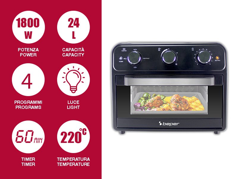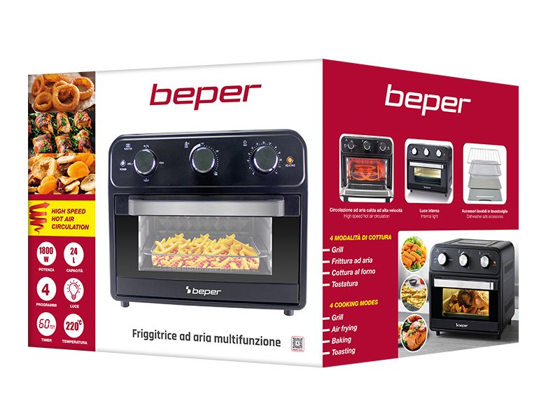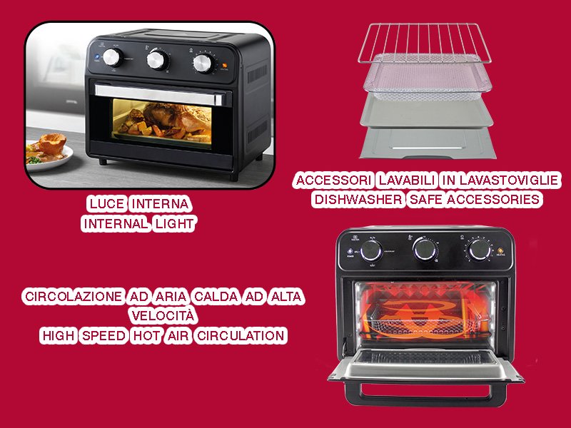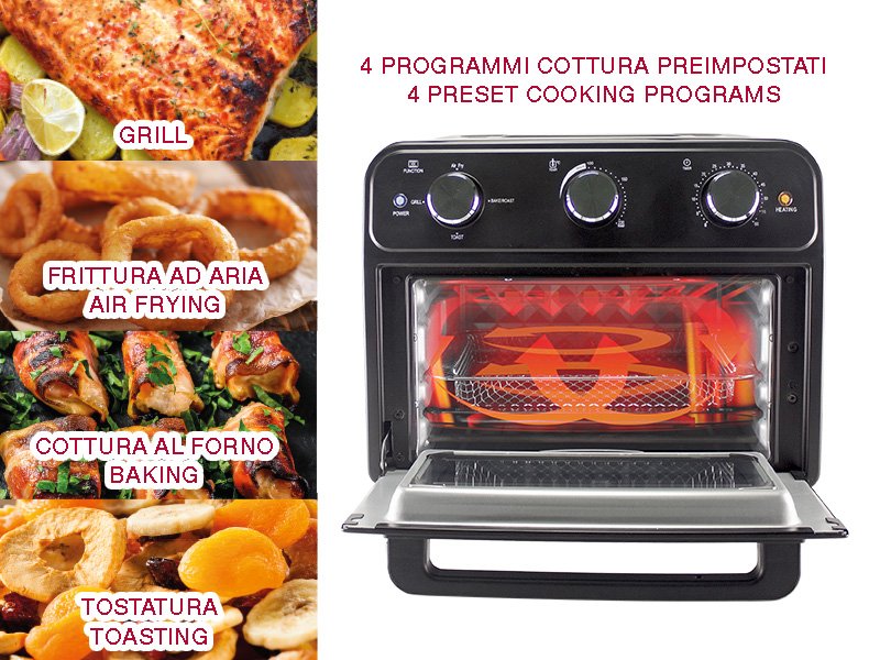 Daudzfunkcionāls karstā gaisa fritieris un cepeškrāsns ar 4 gatavošanas režīmiem: grilu, cepšanu ar gaisu, cepšanu cepeškrāsnī un dažādu ēdienu grilēšanu, tostarp frī kartupeļu, gaļas, vistas, zivju, desertu un citu ēdienu, gatavošanai; ēdienu žāvēšanai un mājās gatavotu buljona kubiņu gatavošanai.