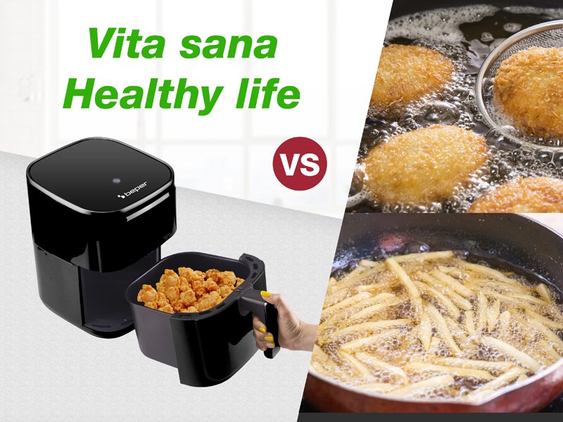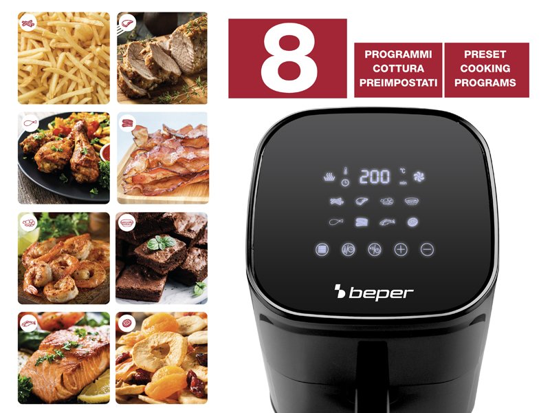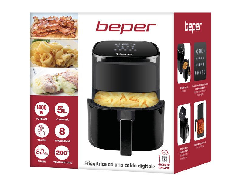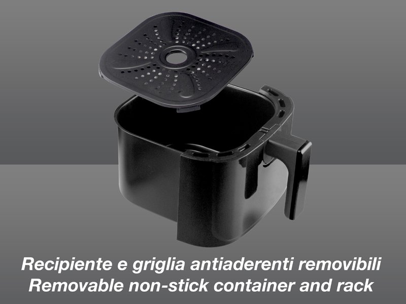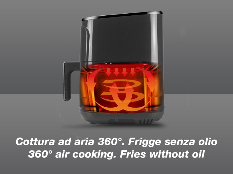 Karstā gaisa fritieris ir veselīgākā alternatīva tradicionālajai cepšanai, jo tā ļauj cept bez eļļas vai ar ļoti mazu eļļas daudzumu. Ideāli piemērots arī grauzdēšanai, cepšanai un grilēšanai. Digitālais vadības panelis ar jutīgu pieskāriena sensoru, lai izvēlētos no 8 iepriekš iestatītām programmām, pielāgotu temperatūru no 80 līdz 200°C un iestatītu taimeri līdz 60 minūtēm. 5 litru tilpuma tvertne un noņemams nepiedegošs alumīnija režģis ērtai tīrīšanai. Aizsardzība pret pārkaršanu.