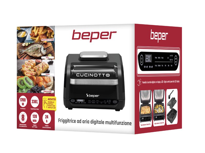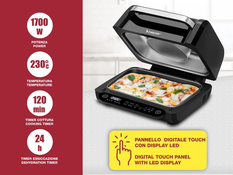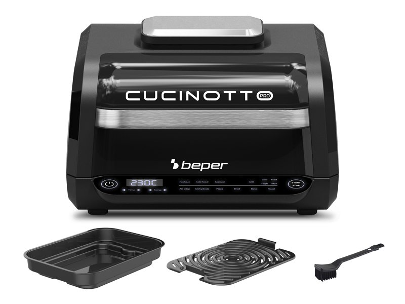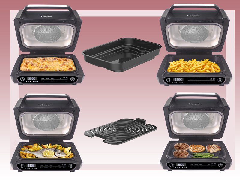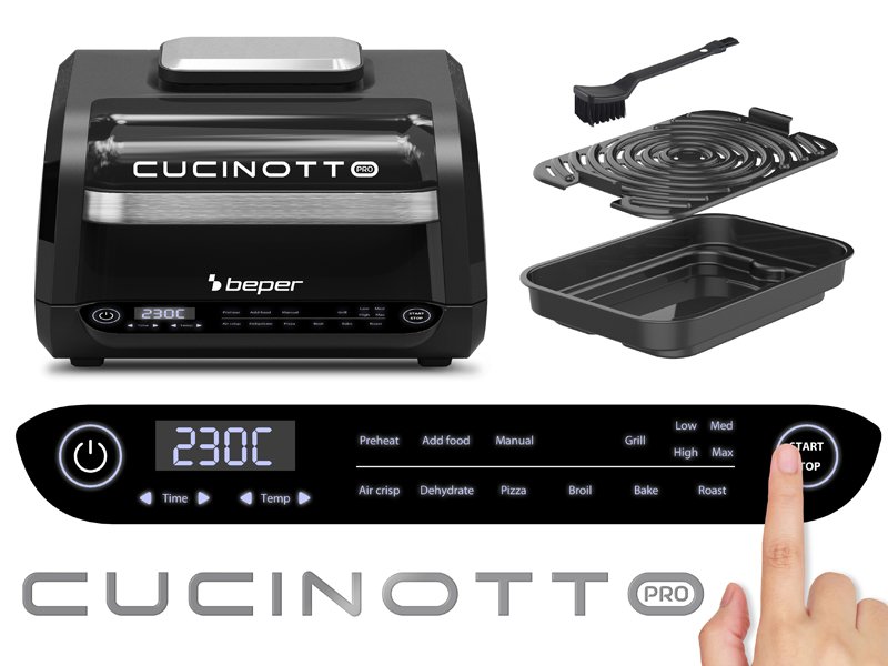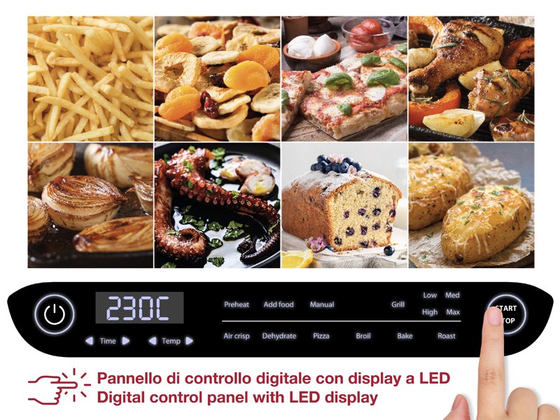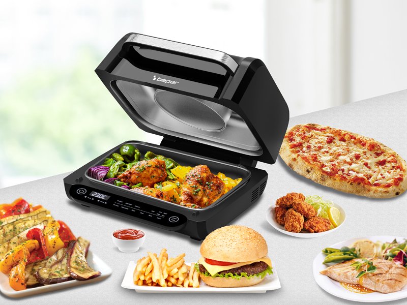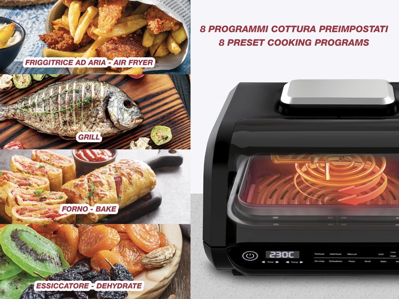 8 gatavošanas programmas: gaisa kraukšķināšana, cepšana, grils (4 līmeņi), dehidrēšana, cepšana, pica un manuālais režīms.
