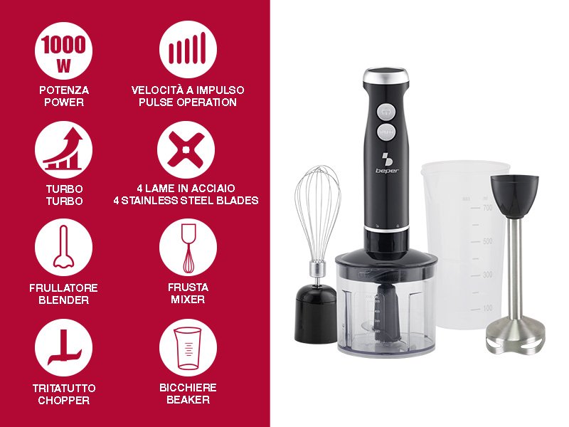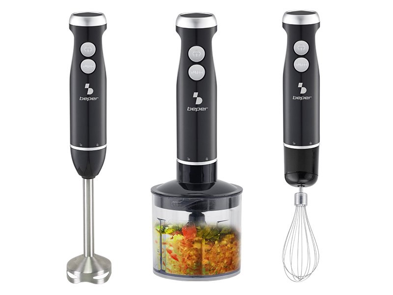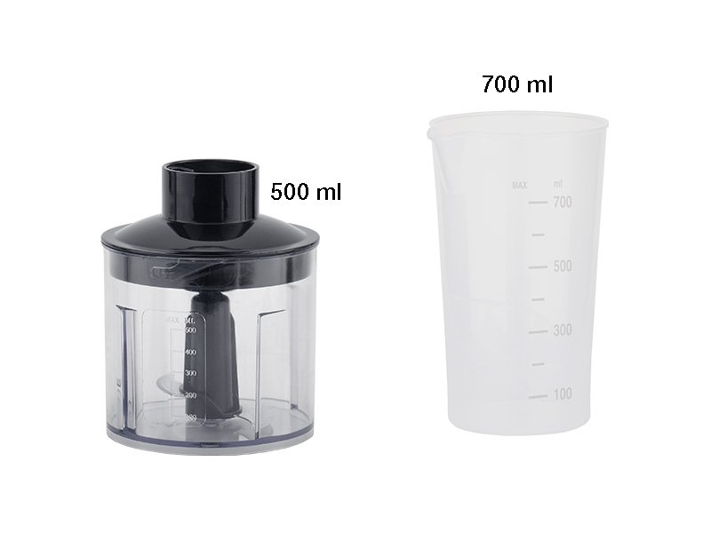 4-vienā iegremdējamā blendera komplekts ar dažādiem piederumiem: iegremdējamo blenderi, 500 ml smalcinātāju ar tērauda asmeņiem, 700 ml mērtrauku un tērauda putojamo slotiņu.