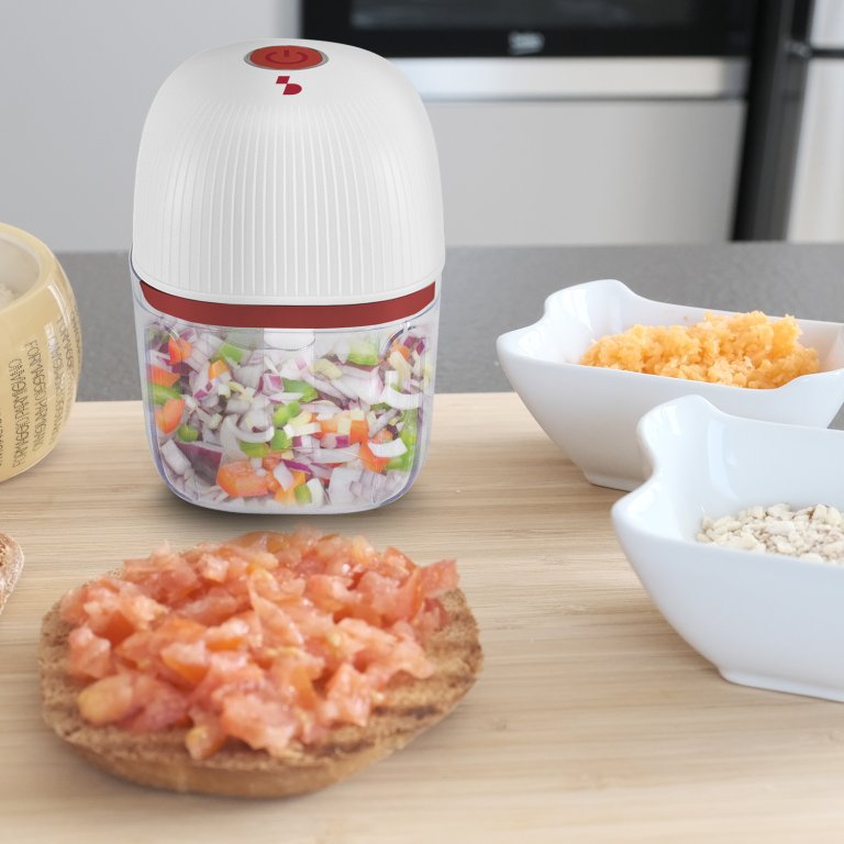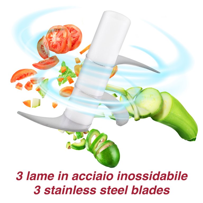 Produktam ir trīs nerūsējošā tērauda asmeņi, kas ātri sasmalcina gaļu, garšaugus un dārzeņus, vienkārši turot nospiestu darbības pogu.