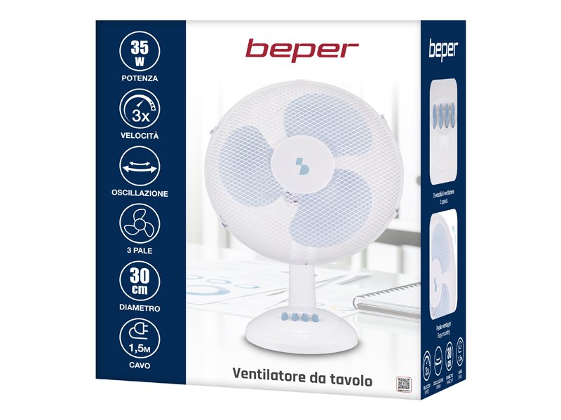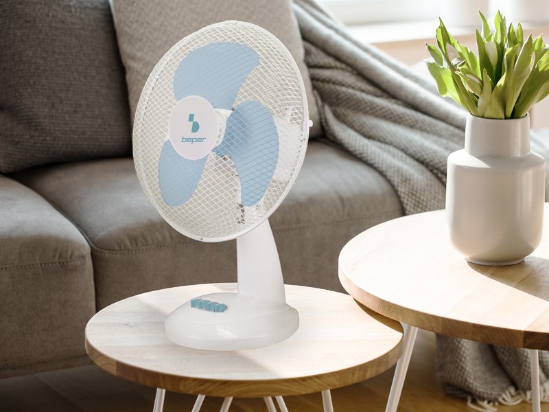 Galda ventilators ar 3 lāpstiņām un tērauda aizsargrežģi, kura diametrs ir 30 cm.