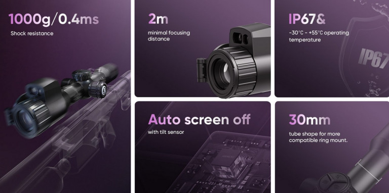 Objektīva izmērs (mm) 40mm, F2.0 Palielinājums X 3.5x to 20.5x (5.8x) Redzes lauks (m) uz 100m 18.7m×10.1m Redzes lauks ° 10.7° × 6.1° Sensora tips FHD CMOS Izsķirtspēja, pikseļi 3840×2160 Ekrāna tips, izšķirtspēja 1920×1080, OLED Baterijas tips 1 iebūvēta + 18650 Baterijas darbības ilgums H 7 Garums (mm) 280.7 Svars (kg) 0.4747 Aizsardzības klase IP67 Tehnoloģija Digitālā Pielietojums Ierīces Zīmols Hikmicro Attāluma mērītājs Lāzera