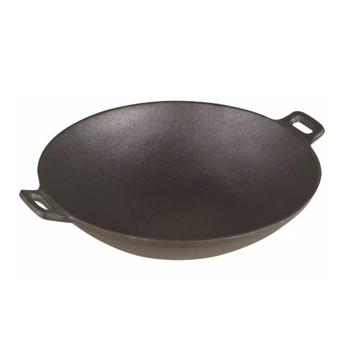 Dzelzs wok panna, Ø31cm, Kinghoff. Izgatavots no augstas kvalitātes čuguna. Ērts rokturis ērtai pārnēsāšanai. Piemērots visu veidu plītīm, ieskaitot indukcijas plītis. Izmērs: ø31 x 8,3 cm.