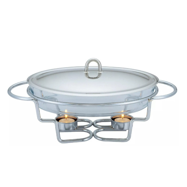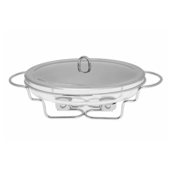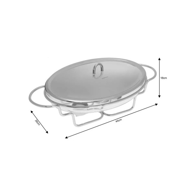 Ēdiena sildītājs, stikls - tērauds, 3l, KH 1411, Kinghoff. Trauki ir izgatavoti no rūdīta stikla. Vāks un rāmis ir izgatavoti no augstākās kvalitātes 18/8 nerūsējošā tērauda. Karstumizturīgais stikls ir paredzēts temperatūrai no -25° līdz +300°. Hromēts nerūsējošais tērauds ar augstāko spīduma līmeni un pulētiem rokturiem. Šī trauka daudzpusība slēpjas faktā, ka to var novietot uz galda tieši no plīts uz komplektā iekļautā statīva ar svecēm, pateicoties kam mūsu trauks visu laiku paliek silts. Visas komplekta daļas var mazgāt atsevišķi, kas atvieglo tā tīrību. Droši mazgājams trauku mazgājamajā mašīnā. Izmēri: Tilpums 3l, Augstums 18 cm, Platums 26 cm, Garums 44 cm.