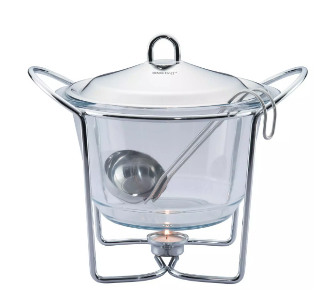 Ēdiena sildītājs, stikls-tērauds, 4 l, Kinghoff, KH 1413. Vāks izgatavots no augstas kvalitātes nerūsējošā tērauda. Rūdītais stikls ražots Francijā – Sabinex. Stikla ieliktnis metāla pamatnē. Ēdiena sildīšanai izmanto sveces. Droši mazgājams automātiskajās trauku mazgājamajās mašīnās. Tilpums: 4,0 l.