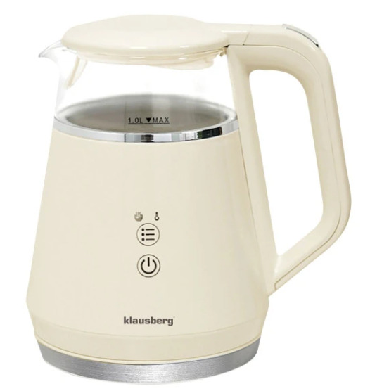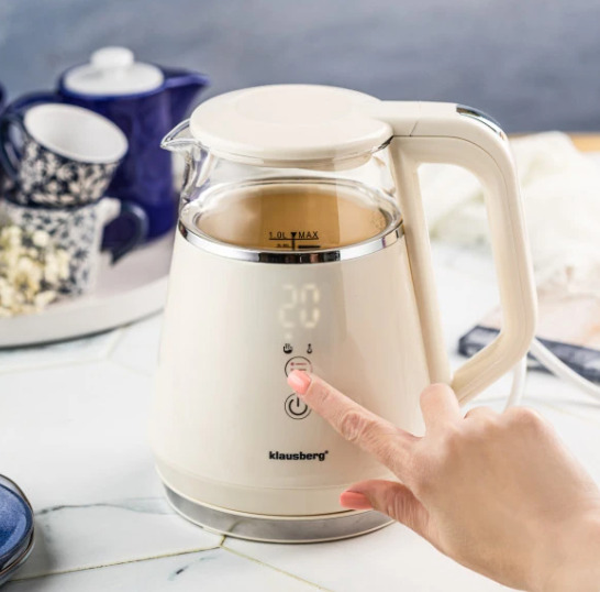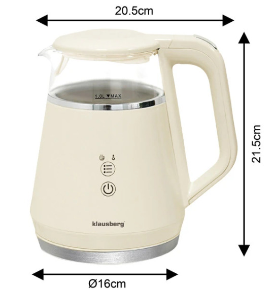 Elektriskā tējkanna Klausberg KB 7893 no stikla ar LED paneli, krēmkrāsā, tilpums 1,0 l un jauda 900–1100 W. 1 litra ietilpība ir ideāli piemērota ikdienas lietošanai mājās vai birojā, bet 900–1100 W jauda nodrošina ātru un energoefektīvu ūdens uzvārīšanu. Tējkannai ir 5 pakāpju temperatūras regulēšana: 40°C, 70°C, 80°C, 90°C un 100°C, kas nodrošina precīzus iestatījumus dažādu dzērienu pagatavošanai, kā arī siltuma uzturēšanas funkcija, kas saglabā izvēlēto temperatūru līdz 2 stundām, lai ūdens vienmēr būtu gatavs lietošanai. Skārienjutīgais LED panelis nodrošina intuitīvu un modernu vadību, savukārt plakanais nerūsējošā tērauda sildelements garantē vieglu tīrīšanu, higiēnisku lietošanu un ilgmūžību. Borosilikāta stikla korpuss ir izturīgs pret karstumu, ilgmūžīgs un vizuāli pievilcīgs, bet 360° grozāmā pamatne nodrošina ērtu lietošanu gan labročiem, gan kreiļiem. Maksimālai drošībai tējkanna ir aprīkota ar automātisko izslēgšanos, aizsardzību pret pārkaršanu un ieslēgšanu bez ūdens, savukārt elegantā krēmkrāsa un minimālistiskais dizains lieliski iederas gan klasiskā, gan modernā interjerā.
