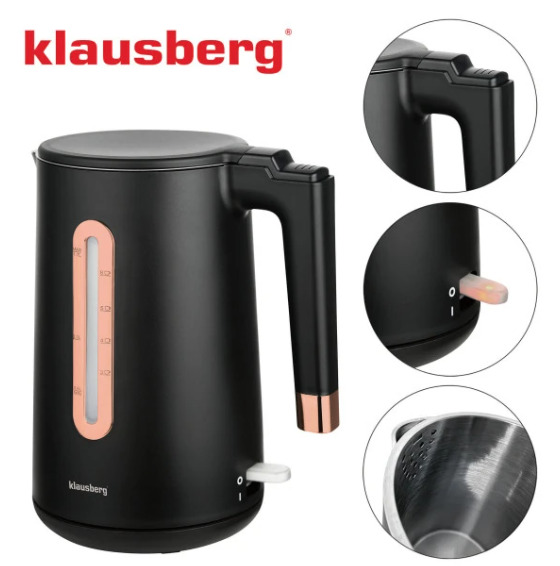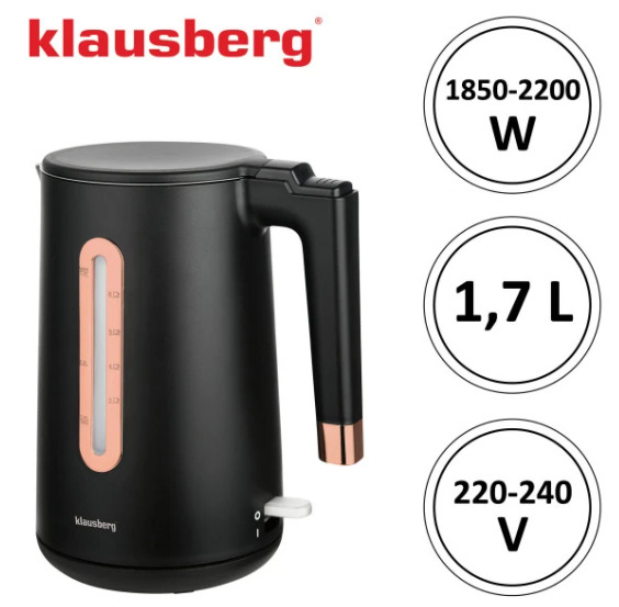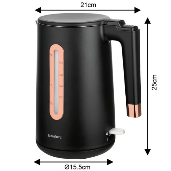 Elektriskā tējkanna Klausberg KB 7889 no nerūsējošā tērauda melnā/rozā zelta krāsā ar tilpumu 1,7 l un jaudu 1850–2200 W. 1,7 litru ietilpība ir ideāli piemērota vairāku tasīšu tējas, kafijas vai verdoša ūdens pagatavošanai ēdiena gatavošanai, bet jaudīgais 1850–2200 W sildelements nodrošina ātru un efektīvu ūdens uzvārīšanu. Izgatavota no izturīga 304 nerūsējošā tērauda un PP plastmasas, tā ir noturīga pret koroziju, ilgmūžīga un eleganta. Matētais melnais korpuss ar rozā zelta elementiem piešķir virtuvei augstvērtīgu izskatu. Slēptais plakanais sildelements nodrošina higiēnisku lietošanu un vieglu tīrīšanu, bet 360° grozāmā pamatne ļauj ērti lietot gan labročiem, gan kreiļiem. Snīpis ar filtrējošām atverēm nodrošina tīru ūdeni bez nosēdumiem un kaļķakmens, savukārt lielais, viegli nolasāmais ūdens līmeņa indikators ļauj ātri kontrolēt ūdens daudzumu. Ergonomiska, ērti satverama roktura konstrukcija nodrošina komfortu ikdienā, bet klusā darbība ir ideāli piemērota mājām, kur svarīgs miers. Drošību nodrošina automātiskā izslēgšanās, aizsardzība pret pārkaršanu, termiskā izolācija, kas samazina korpusa uzkaršanu, un stabila konstrukcija ar neslīdošu pamatni drošai novietošanai uz darba virsmas.