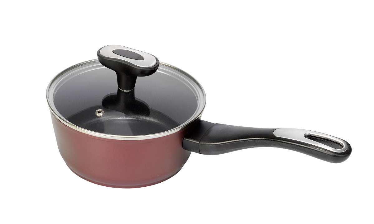Saucepan 16 cm. ar rūdīta stikla vāku. Augstums 7 cm. Jauda 1,1 l.