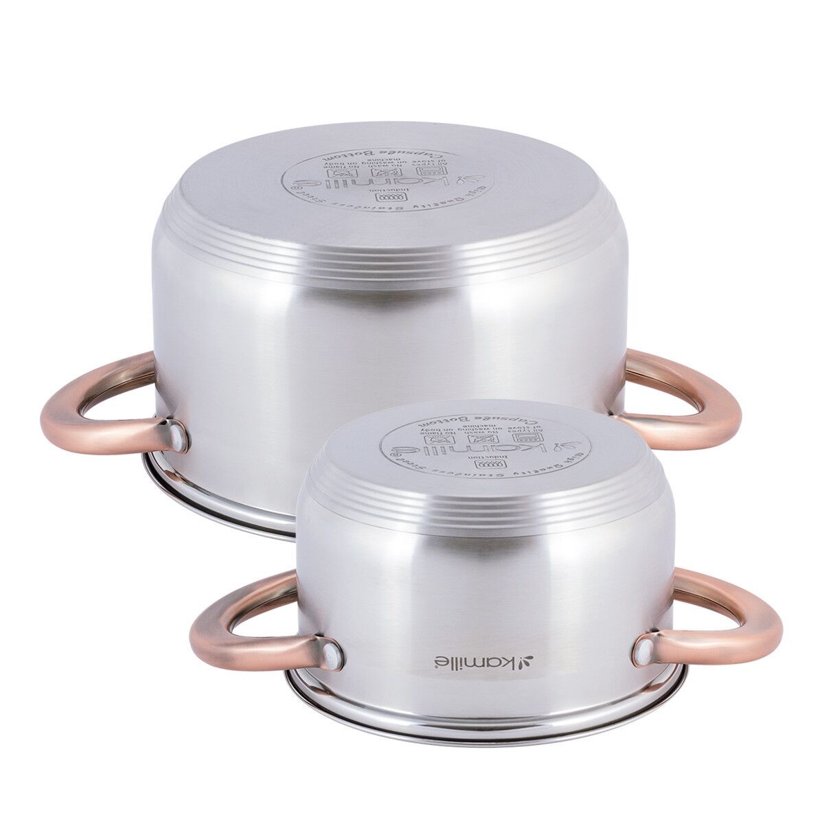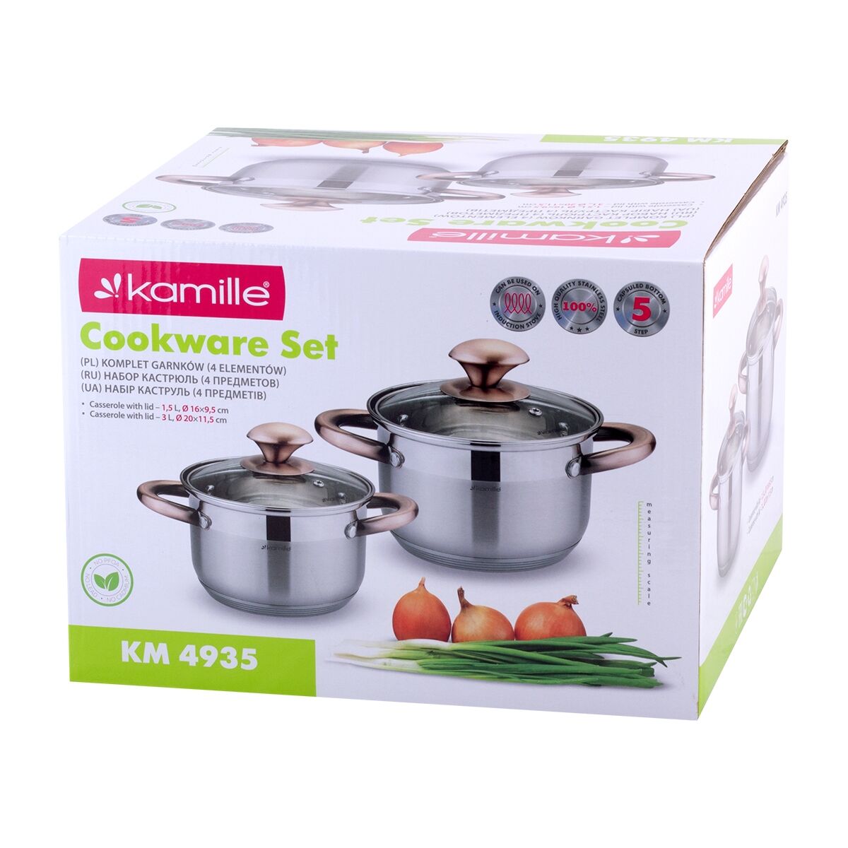 Katlu komplekts 2 gab. (1.5L, 3.0L), 4935, Kamille. Komplektā ietilpst 4 elementi (1.5L/16×9.5 cm, 3.0L/20×11.5 cm) ar stikla vākiem. Izgatavoti no nerūsējošā tērauda ar dobjiem rokturiem. Katlu iekšpusē ir mērskala. Piemēroti visiem plīts veidiem.