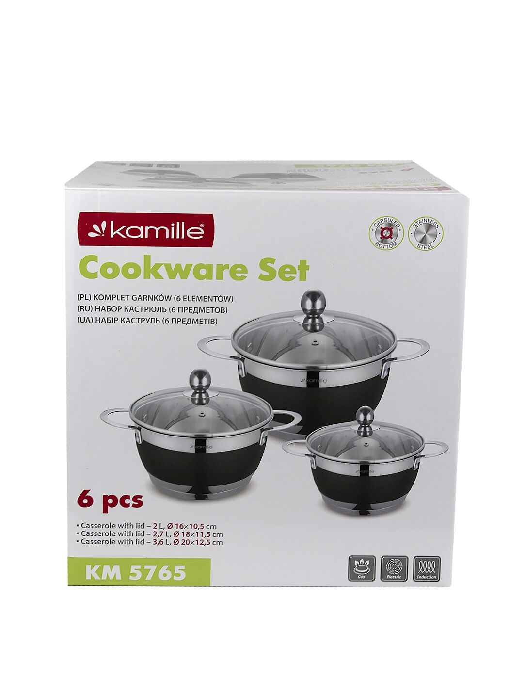 Katlu komplekts 3 gab. (2.0L, 2.7L, 3.6L), 5765, Kamille. Komplektā ietilpst 6 elementi (2.0L/16×10.5 cm, 2.7L/18×11.5 cm, 3.6L/20×12.5 cm) ar stikla vākiem. Izgatavoti no augstas kvalitātes nerūsējošā tērauda. Katlu iekšpusē ir mērskala. Piemēroti visiem plīts veidiem.