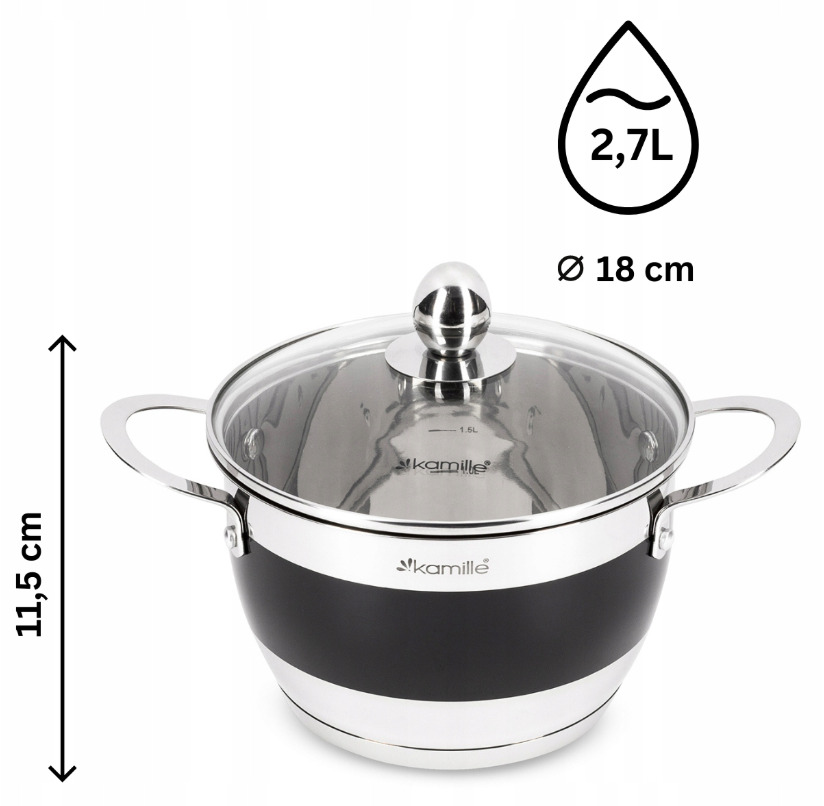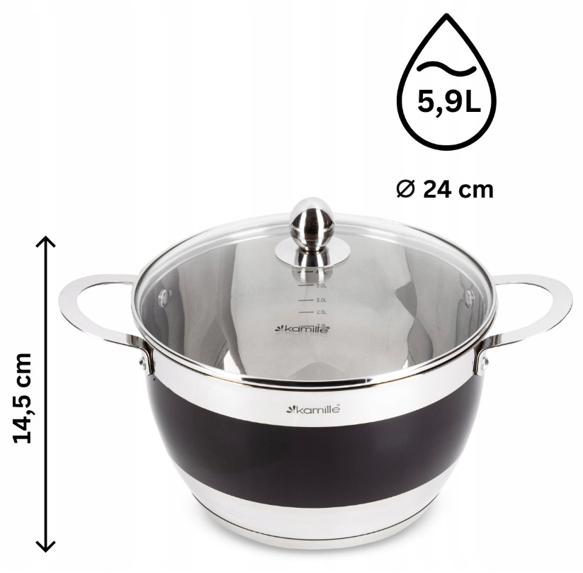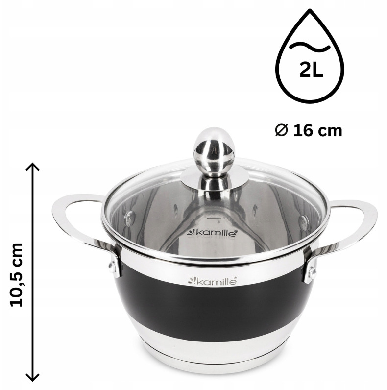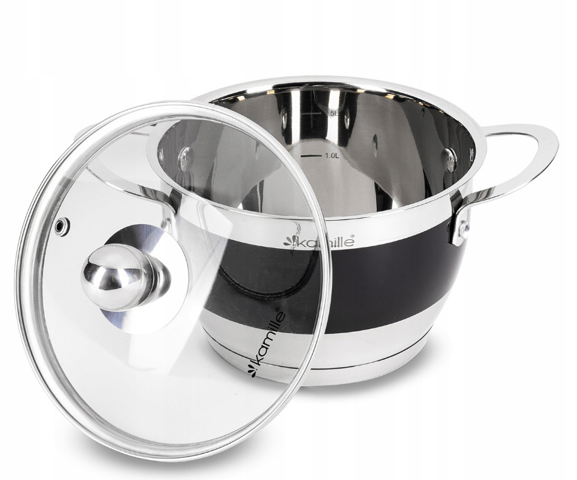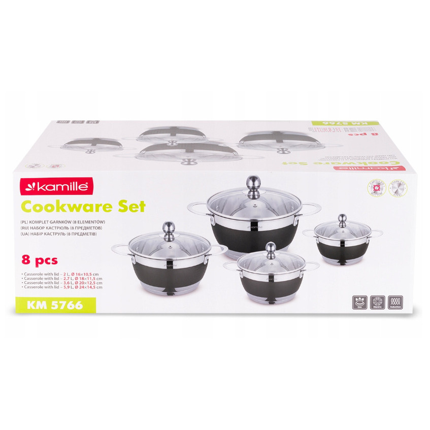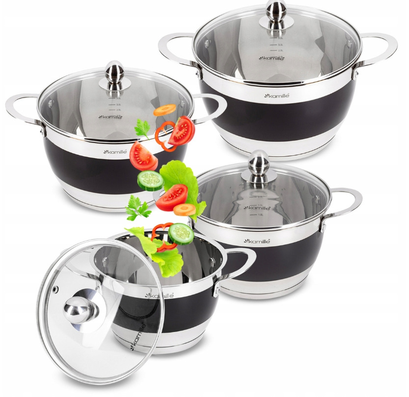 Katlu komplekts 4 gab. (2.0L, 2.7L, 3.6L, 5.9L), 5766, Kamille. Komplektā ietilpst 8 elementi (2.0L/16×10.5 cm, 2.7L/18×11.5 cm, 3.6L/20×12.5 cm, 5.9L/24×14.5 cm) ar stikla vākiem. Izgatavoti no augstas kvalitātes nerūsējošā tērauda. Katlu iekšpusē ir mērskala. Piemēroti visiem plīts veidiem.