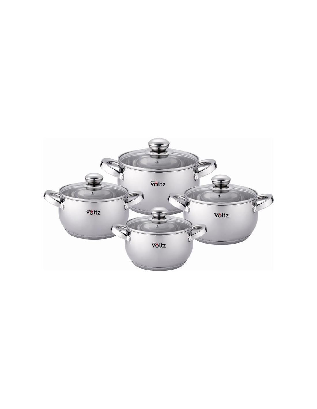 Oliver Voltz OV51210G8B, 8 daļu nerūsējošā tērauda virtuves piederumu komplekts. Augstas kvalitātes izturīgs nerūsējošā tērauda virtuves piederumu komplekts. Īpašs daudzslāņu termiskais dibens optimālai siltuma vadīšanai. Nerūsējošā tērauda rokturi ar kniedes stiprinājumu uz trauka korpusa papildu izturībai. Rūdīta stikla vāki ar tvaika izlaišanas atveri. Ar tilpuma mērīšanas skalu. Piemērots visu veidu sildīšanas avotiem: gāzes, stikla keramikas, elektriskajai, halogēna un indukcijas. Taupa enerģiju, ātri sasniedzot vēlamo gatavošanas temperatūru. Droši mazgājams trauku mazgājamajā mašīnā. Komplekta sastāvdaļas: