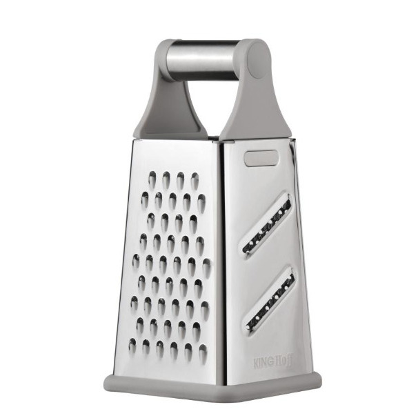 Kinghoff 4-pušu rīve, augstums 21.5 cm, KH 1992. Izgatavota no augstas kvalitātes nerūsējošā tērauda. Četri dažāda veida asmeņi rīvēšanai un griešanai. Silikona pamatne novērš rīves slīdēšanu. Ērts metāla rokturis nodrošina stingru satvērienu. Augstums: 21.5 cm. Pamatnes izmēri: 10.3 × 10.3 cm.