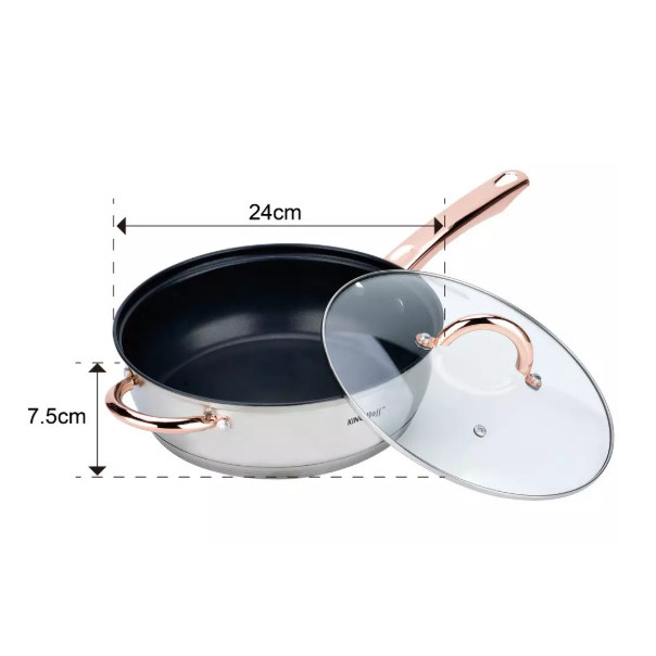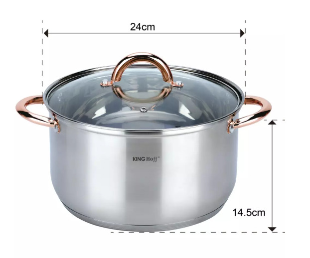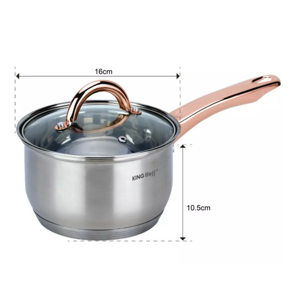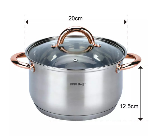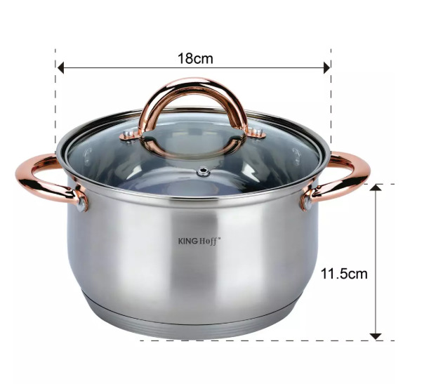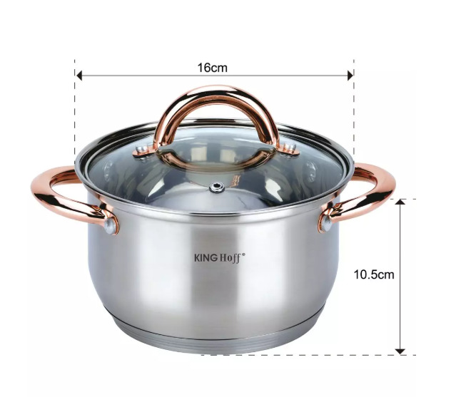KINGHoff rozā zelta krāsas katlu komplekts, 12 daļas, KH 1765. Izgatavots no augstas kvalitātes nerūsējošā tērauda. Daudzslāņu termiskais dibens, kas saglabā siltumu. Ēdiens uzsilst ātri un saglabā siltumu ilgu laiku. Piemērots visiem sildīšanas veidiem: gāzes, elektriskajām, keramikas, stikla, halogēna un indukcijas plītīm. Veselīga ēdiena pagatavošana, izmantojot maz ūdens un cepšanu ar minimālu tauku daudzumu, samazina vitamīnu, minerālvielu un garšas zudumu. Īpaši piemērots diētiskām ēdienkartēm, kad ēdienus nedrīkst sālīt. Karstumizturīgi rokturi. Pievilcīgs izskats apvienojumā ar praktiskumu. Ēdiena un tauku daļiņas neuzkrājas malu salaiduma vietās. Viegli mazgājams. Piemērots mazgāšanai trauku mazgājamā mašīnā. Komplektā ietilpst: kastrolis ar vāku Ø16 x 10.5 cm 2.1 l. Katls ar vāku Ø16 x 10.5 cm 2.1 l. Katls ar vāku Ø18 x 11.5 cm 2.9 l. Katls ar vāku Ø20 x 12.5 cm 3.9 l. Katls ar vāku Ø24 x 14.5 cm 6.6 l. Panna ar vāku Ø24 x 7.5 cm 3.4 l.