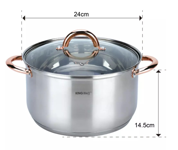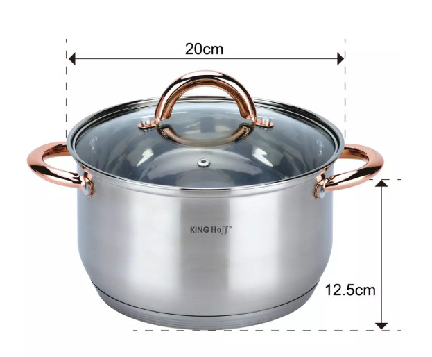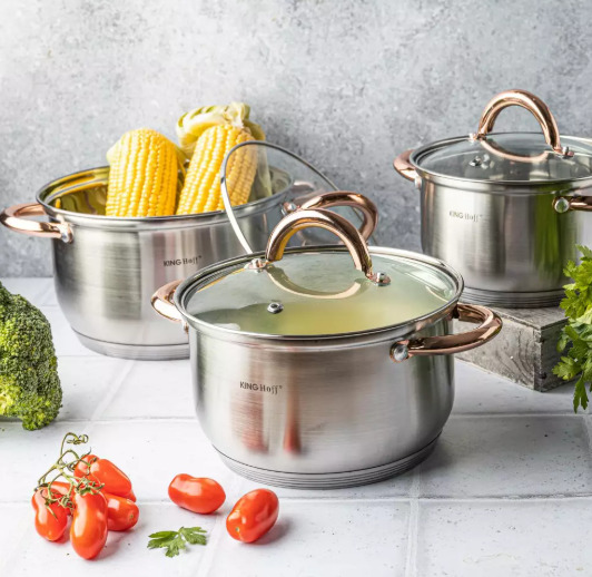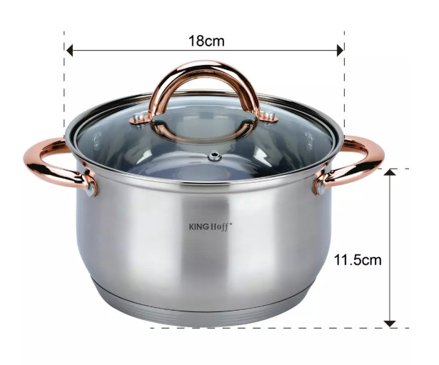 KINGHoff rozā zelta krāsas katlu komplekts, 6 daļas, Ø18, Ø20, Ø24, KH 1762. Izgatavots no augstas kvalitātes nerūsējošā tērauda. Daudzslāņu termiskais dibens, kas saglabā siltumu. Ēdiens uzsilst ātri un saglabā siltumu ilgu laiku. Piemērots visiem sildīšanas veidiem: gāzes, elektriskajām, keramikas, stikla, halogēna un indukcijas plītīm. Veselīga ēdiena pagatavošana, izmantojot maz ūdens un minimālu tauku daudzumu, samazina vitamīnu, minerālvielu un garšas zudumu. Īpaši piemērots diētiskām ēdienkartēm, kad ēdienus nedrīkst sālīt. Karstumizturīgi rokturi. Pievilcīgs izskats apvienojumā ar praktiskumu. Ēdiena un tauku daļiņas neuzkrājas malu salaiduma vietās. Viegli mazgājams. Piemērots mazgāšanai trauku mazgājamā mašīnā. Komplektā ietilpst: katls ar vāku Ø18 x 11.5 cm 2.9 l. Katls ar vāku Ø20 x 12.5 cm 3.9 l. Katls ar vāku Ø24 x 14.5 cm 6.6 l.