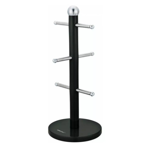 Krūzīšu plaukts, tērauds, melns Kinghoff. Statīvs 6 krūzēm, krūzēm. Augsts tērauda apstrādes standarts. Pulverkrāsota virsma. Izmēri: augstums 36 cm, diametrs 15 cm.