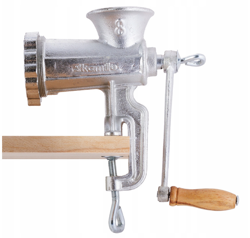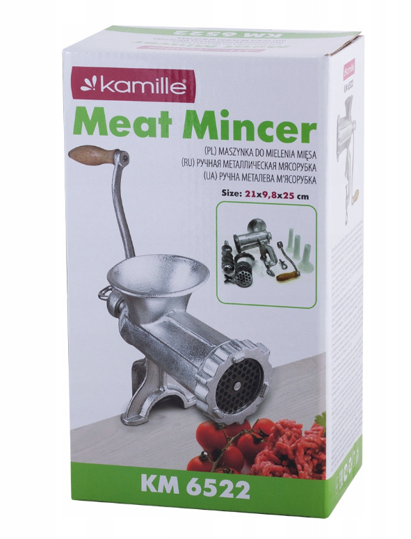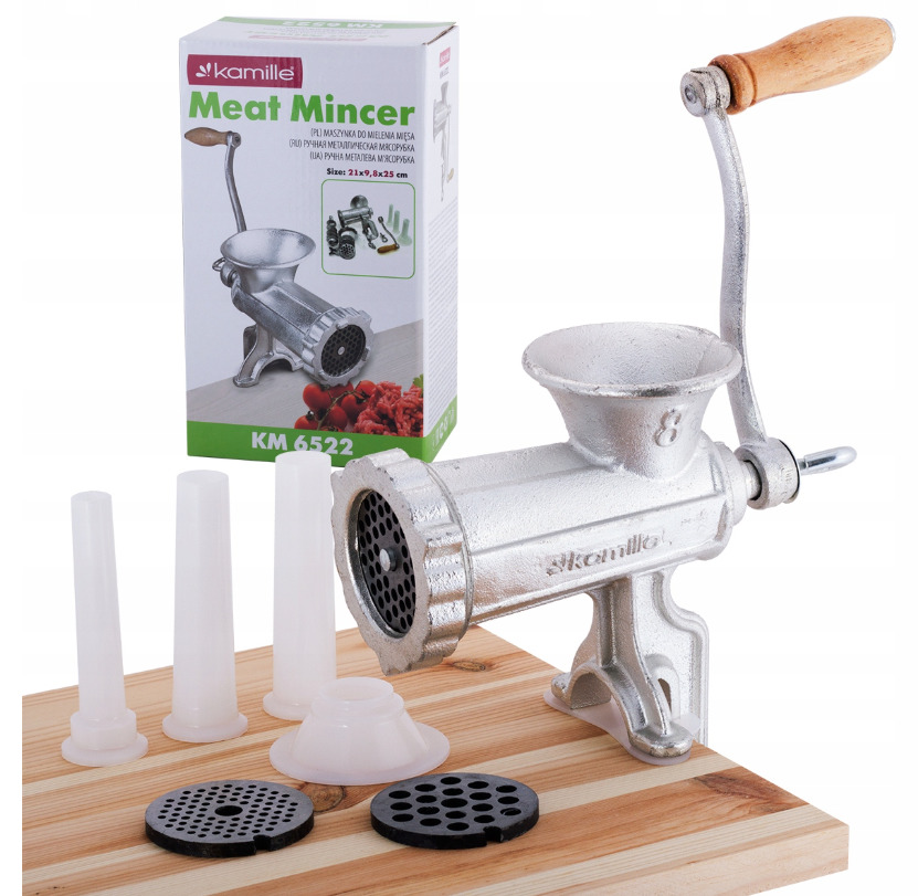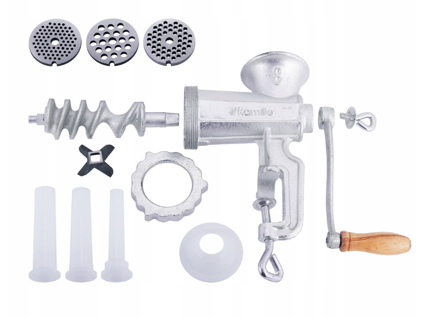Manuālā gaļas maļamā mašīna, 6522, KAMILLE. Izgatavota pilnībā no čuguna un pārklāta ar pret rūsu izturīgu cinka pārklājumu. Komplektā ietilpst: gaļas maļamā mašīna, nazis, 3 malšanas sietiņi, 3 uzgaļi desu pildīšanai, kloķa rokturis un stiprinājuma skava. Droši piestiprināma pie galda virsmas ar skavu.