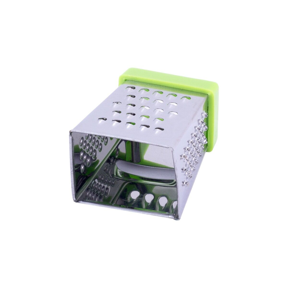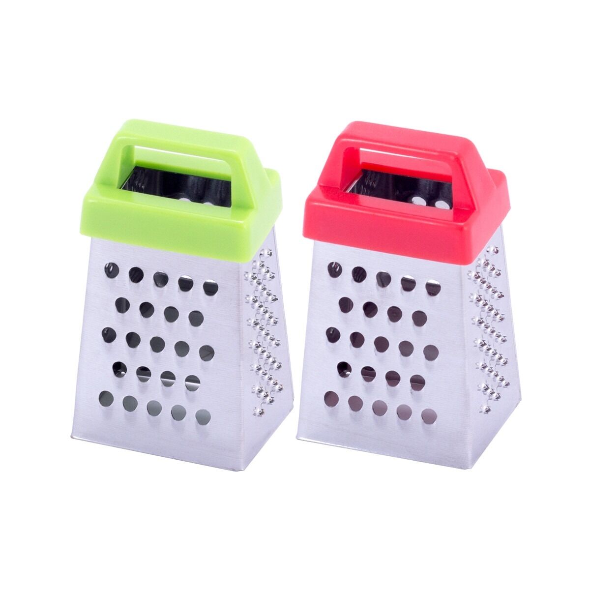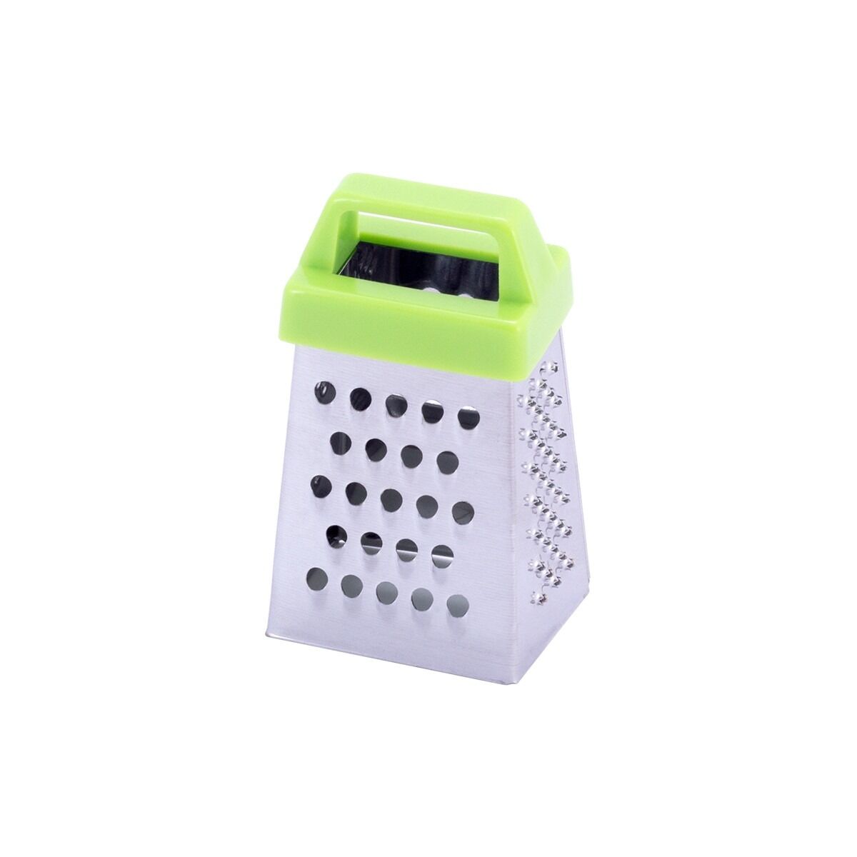 Mini četrpusīga nerūsējošā tērauda rīve, 7208, Kamille. Izgatavota no nerūsējošā tērauda ar plastmasas rokturi. Ir 4 asmeņu tipi. Izmēri: 3.5×2.7×6.5cm. Ērta un viegli lietojama. Praktiska un noderīga katrā mājā. Ieteicama roku mazgāšana.