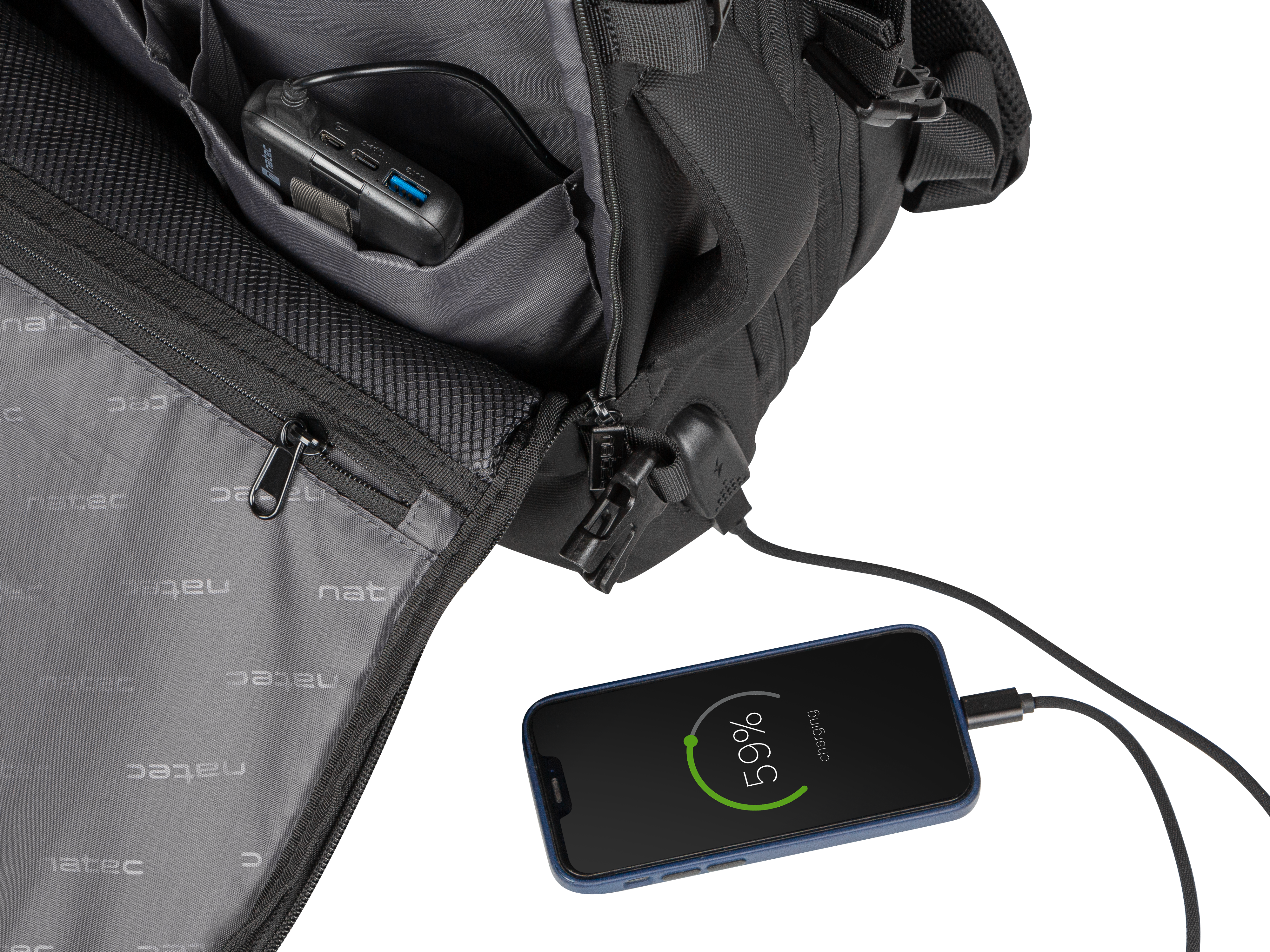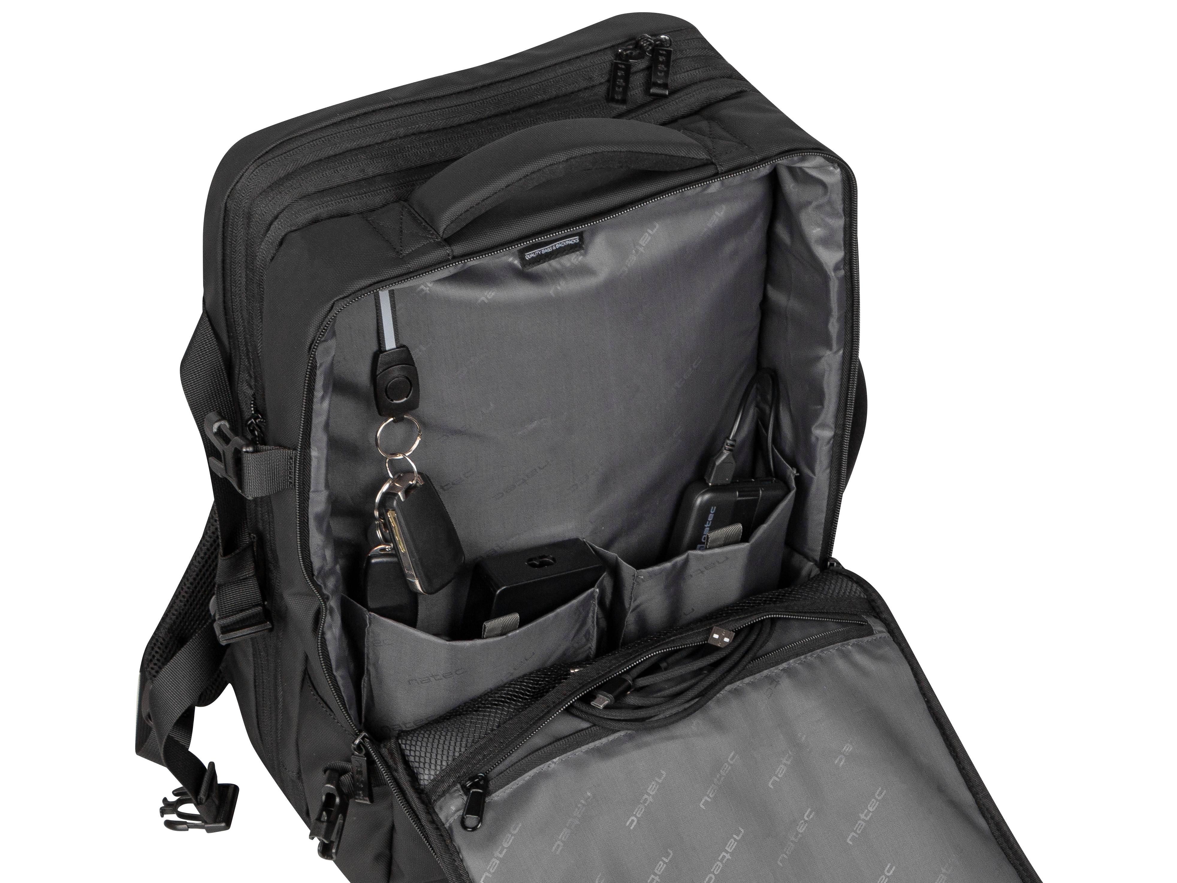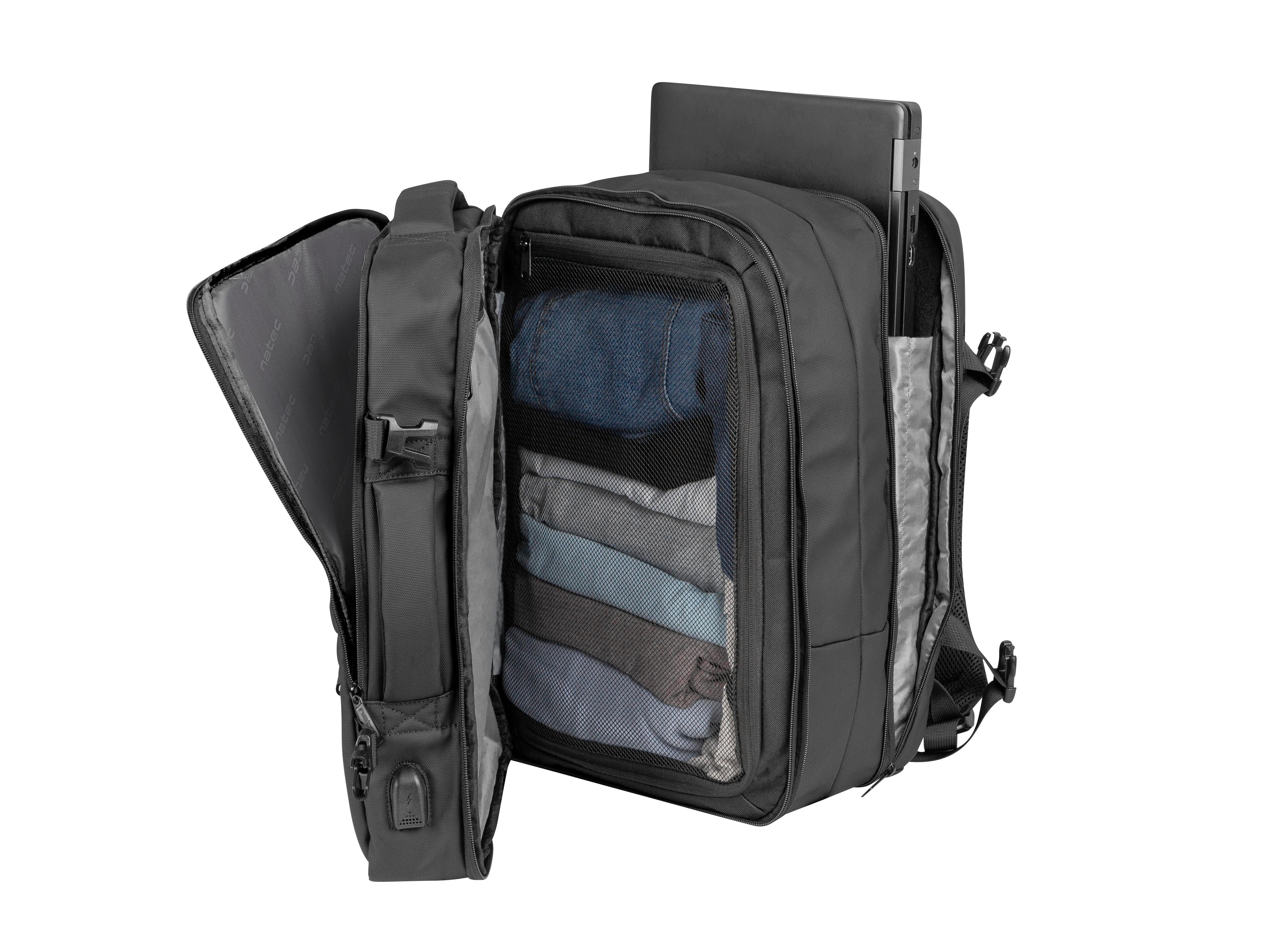 | Iespējas | Waterproof, USB charging socket, padded notebook compartment |