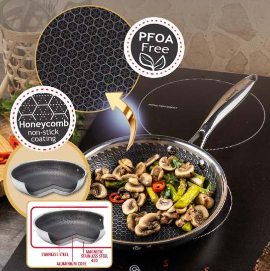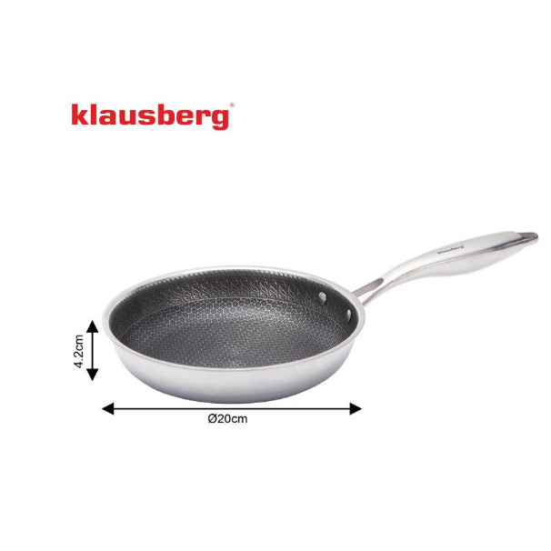 Nerūsējošā tērauda panna, ø20cm, KB 9021, Klausberg. Nelīpošs pārklājums šūnveida struktūrā, lai novērstu pielipšanu. Drošs veselībai – bez PFOA. TRĪSKĀRŠA konstrukcija (3 slāņi) labākai izturībai. Ātra un vienmērīga uzsilšana. Izgatavots no korozijizturīga nerūsējošā tērauda. Iespējama cepšana ar minimālu tauku daudzumu. Izturība pret skrāpējumiem, pateicoties virsmas struktūrai. Saderīgs ar visu veidu plītīm. Moderns, elegants izskats. Diametrs: 20 cm. Augstums: aptuveni 4,2 cm.