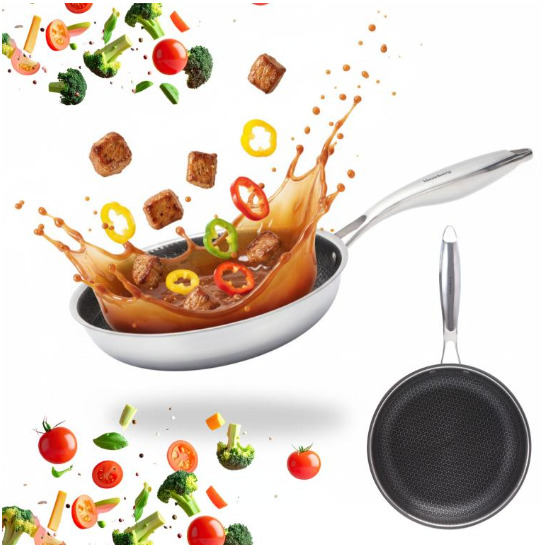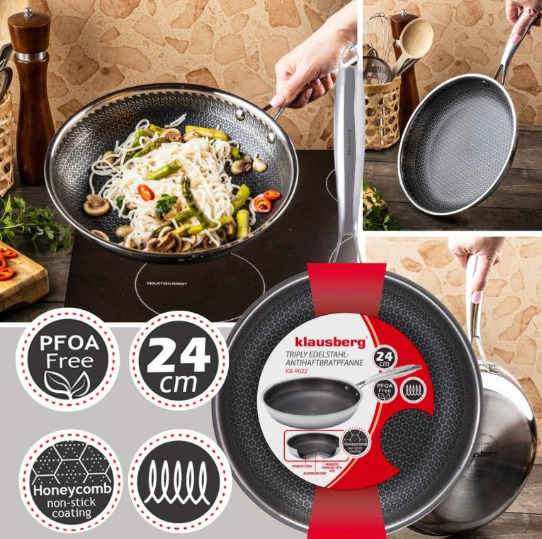 Nerūsējošā tērauda panna, ø24cm, KB 9022, Klausberg. Nelīpošs pārklājums šūnveida struktūrā, lai novērstu pielipšanu. Drošs veselībai – bez PFOA. TRĪSKĀRŠA konstrukcija (3 slāņi) labākai izturībai. Ātra un vienmērīga uzsilšana. Izgatavots no korozijizturīga nerūsējošā tērauda. Iespējama cepšana ar minimālu tauku daudzumu. Izturība pret skrāpējumiem, pateicoties virsmas struktūrai. Saderīgs ar visu veidu plītīm. Moderns, elegants izskats. Diametrs: 24cm. Augstums: aptuveni 4,5 cm.
