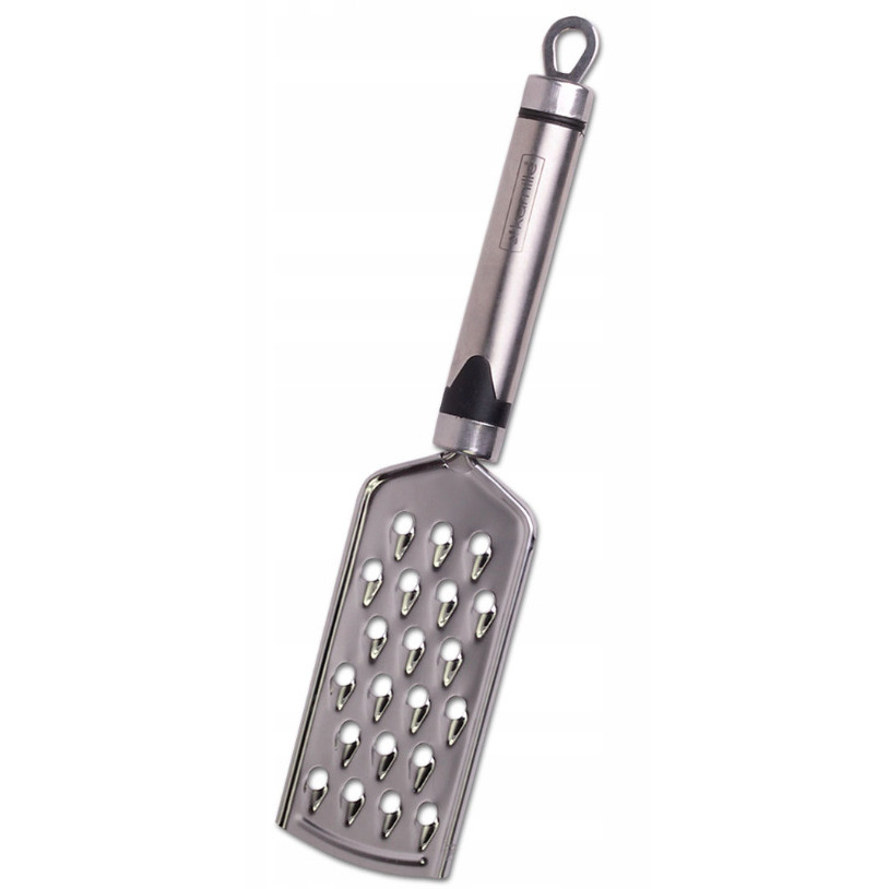 Nerūsējošā tērauda rīve (lielas acis), 14,5×5,5 cm, 5058, KAMILLE. Izgatavota no augstākās kvalitātes nerūsējošā tērauda. Izmēri: 14,5×5,5 cm. Vienmērīgi izvietotās acis ļauj rīvēt gan cietus, gan mīkstus produktus, piemēram, dārzeņus, augļus vai sieru. Viegla un ērta lietošanā. Ieteicama mazgāšana ar rokām.