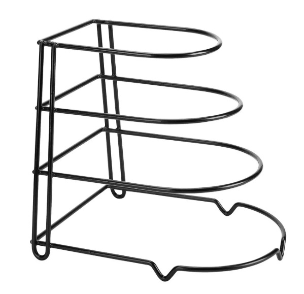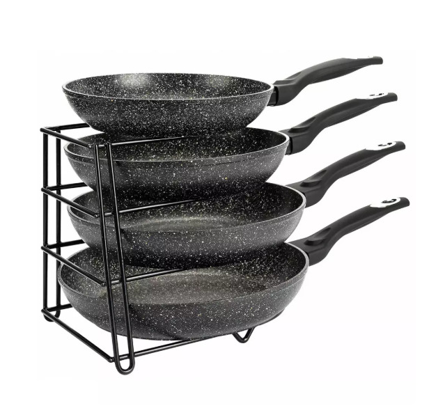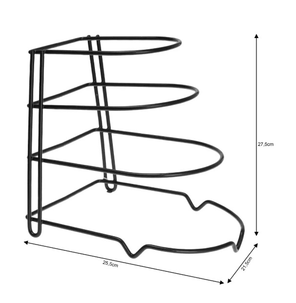 Organizators, 25,5 × 21,5 × 27,5 cm, 4 līmeņu pannas turētājs, Kinghoff tērauds, KH 1582. Aptuvenie izmēri: 25,5 × 21,5 × 27,5 cm. Četrpakāpju dizains atvieglo pannu uzglabāšanu bez kaudzēšanas, pasargājot tās no skrāpējumiem. Var novietot uz letes, skapīša, zem izlietnes vai virtuves skapītī. Taupa vietu, vienlaikus saglabājot izturību, stabilitāti, funkcionalitāti un stilīgu izskatu.