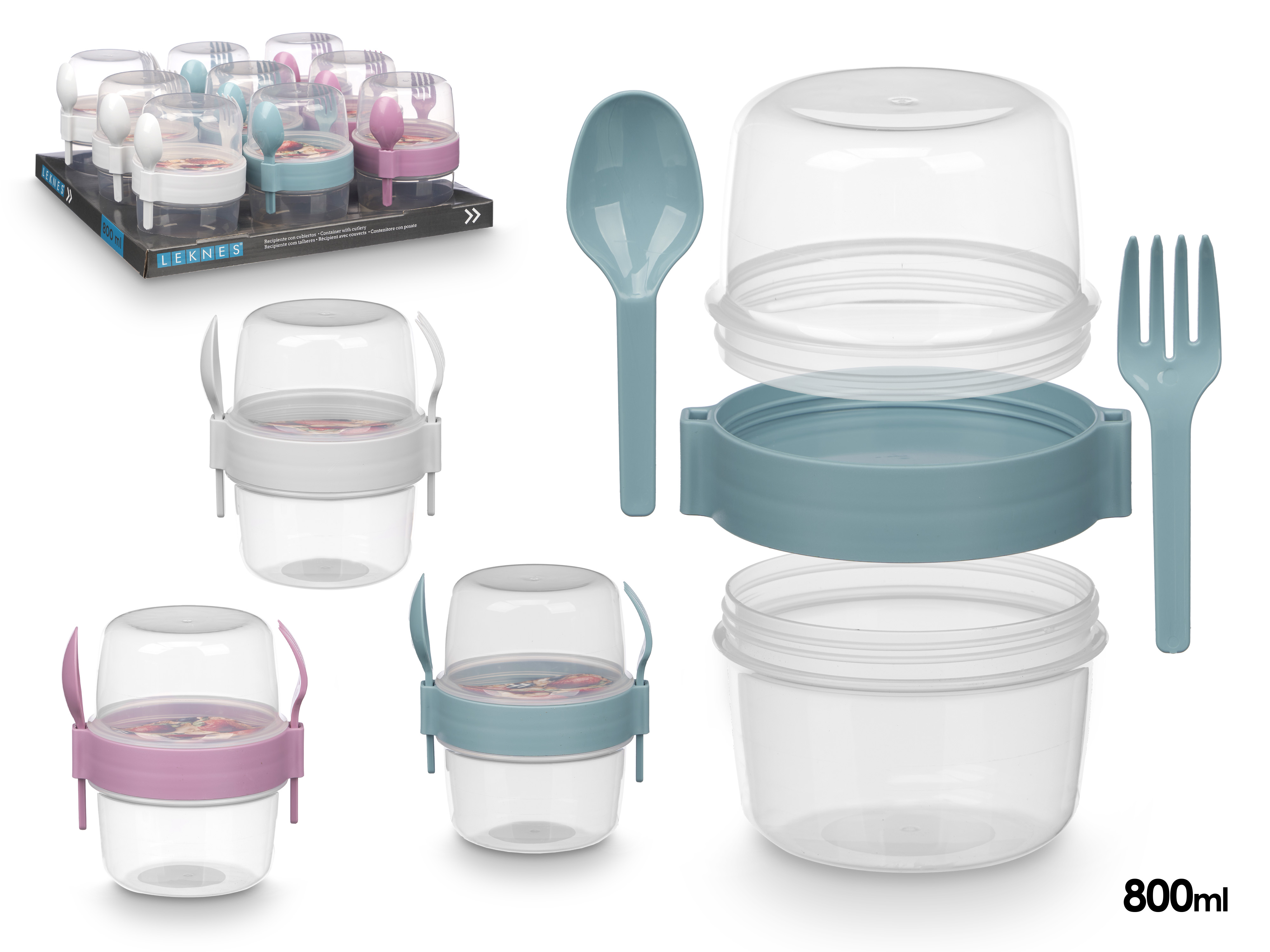 Plastmasas trauks ar galda piederumiem, 800 ml, 3 krāsas, 13.8×12.5×10.2 cm, 94909, Leknes