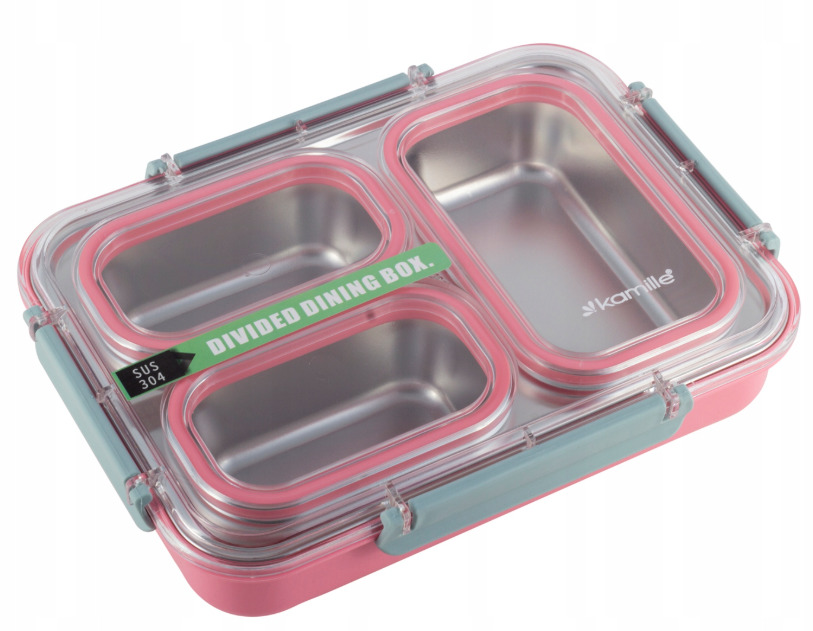 Pusdienu kārba "Lunch Box" 1200 ml, 2146, KAMILLE. Izgatavota no plastmasas, iekšējais trauks – no nerūsējošā tērauda. Tilpums: 1200 ml. Izmēri: 27,5×20×6 cm. Pieejama 3 krāsās: rozā, zaļa, zila.