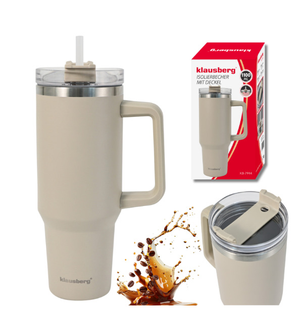 Termokrūze ar salmiņu, bēša, 1100 ml, nerūsējošais tērauds, Klausberg, KB 7944. Liela 1100 ml ietilpība – ideāli piemērota garām maiņām, ceļojumiem un visas dienas izbraucieniem. Izolēts nerūsējošā tērauda korpuss – uztur dzērienus siltus stundām ilgi. Ērts sānu rokturis – stabils un drošs satvēriens pat tad, kad krūze ir pilna. Vāks ar atlokāmu snīpi ērtai dzeršanai un mazākam izliešanas riskam. Salmiņš iekļauts – ideāli piemērots ledus kafijai, smūtijiem vai limonādei. Moderns dizains krēmkrāsas bēšā krāsā ar tērauda malu. Konusveida apakšdaļa (~7,5 cm) – der lielākajai daļai automašīnu un biroja stiprinājumu. Plata atvere (~10 cm) – atvieglo ledus vai augļu šķēļu pievienošanu. Augstums aptuveni 27 cm – lielas ietilpības un ērtas lietošanas apvienojums.