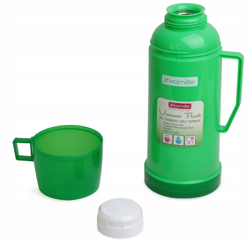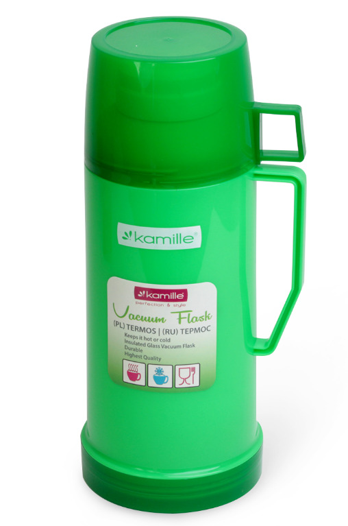 Termoss ar stikla ieliktni 0,45 L, 2070, KAMILLE. Termosa korpuss ir izgatavots no plastmasas, ar stikla ieliktni iekšpusē. Komplektā ietilpst 1 krūzīte. Tilpums: 450 ml. Augstums: 23,5 cm. Pamatnes diametrs: 8,5 cm. Maksimālā siltuma/aukstuma saglabāšana: 12–16 stundas. Pieejams 3 krāsās: zaļa, pelēka, zila.