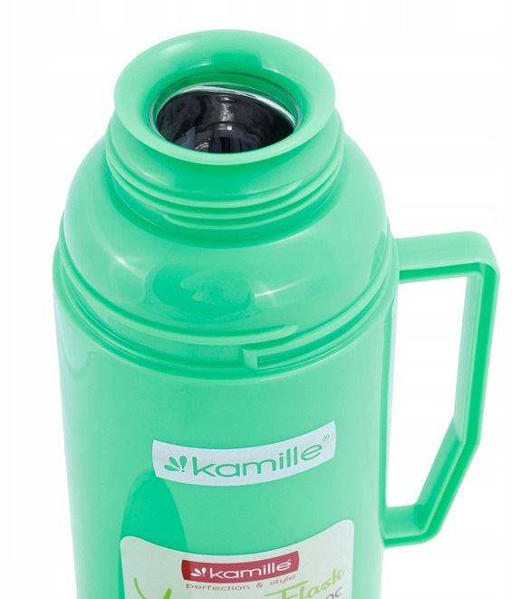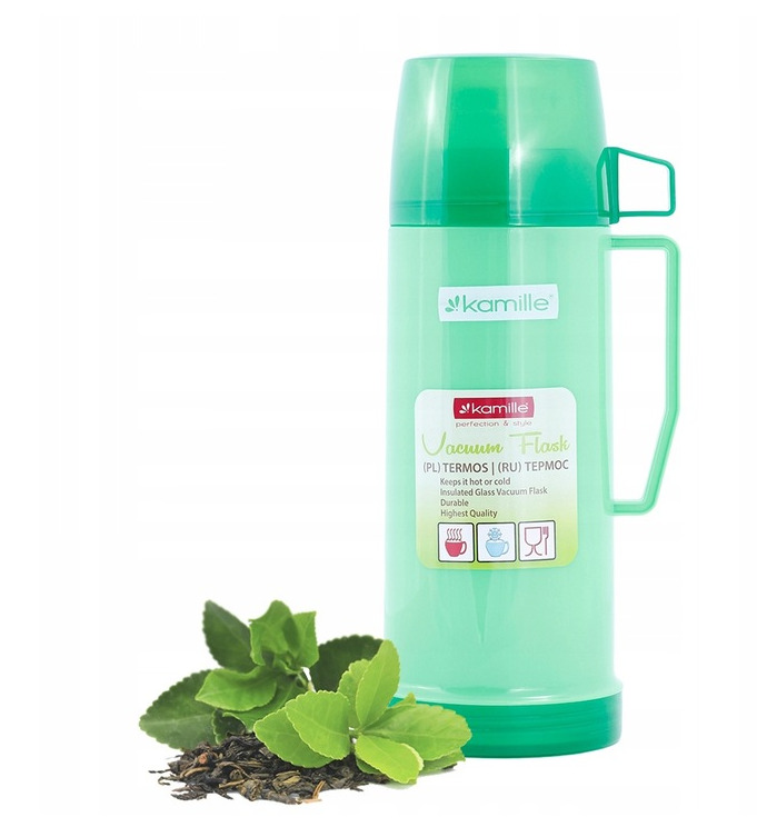 Termoss ar stikla ieliktni 0,6 L, 2071, KAMILLE. Termosa korpuss ir izgatavots no plastmasas, ar stikla ieliktni iekšpusē. Komplektā ietilpst 1 krūzīte. Tilpums: 600 ml. Augstums: 24,5 cm. Pamatnes diametrs: 10 cm. Maksimālā siltuma/aukstuma saglabāšana: 12–16 stundas. Pieejams 3 krāsās: zaļa, pelēka, zila.