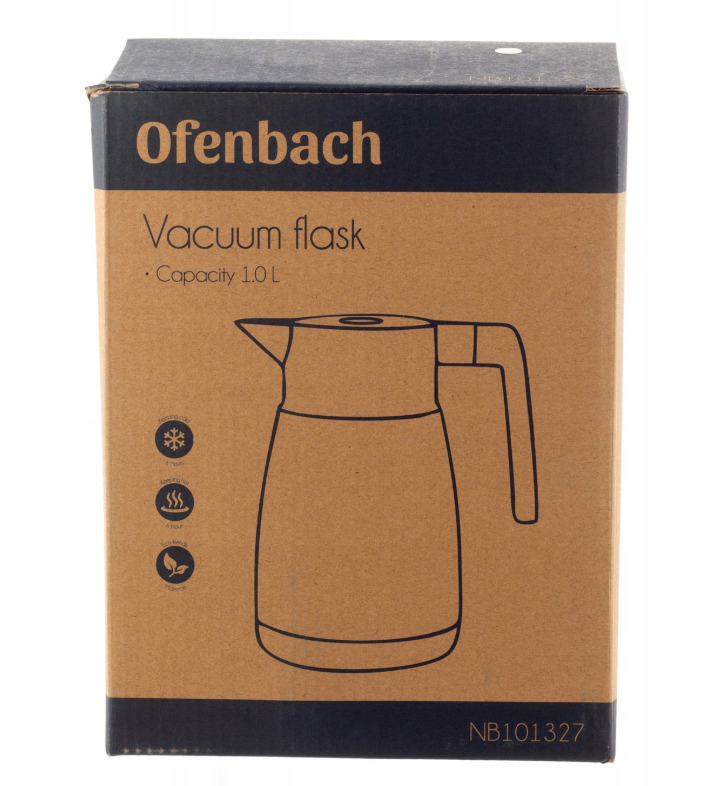 Termoss ar stikla ieliktni 1,0 L, 101327, OFENBACH. Termosa korpuss ir izgatavots no plastmasas, iekšpusē – stikla ieliktnis. Tilpums: 1000 ml. Maksimālā siltuma/aukstuma saglabāšana: 12–16 stundas. Pieejams brūnā krāsā.
