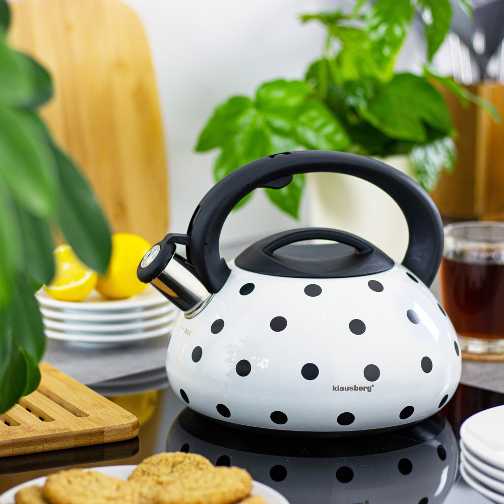 Tradicionāla tējkanna 3 l, balta ar punktiem, Klausberg, KB 7074. Tērauda indukcijas tējkanna ar vienmēr aktuālo lielo punktu motīvu, kas maina krāsu atkarībā no temperatūras. Piemērota visiem plīts veidiem. Aprīkota ar noņemamu vāku un atveramu svilpīti. Šī tējkanna ir īsts hits starp tirgū pieejamajiem modeļiem.