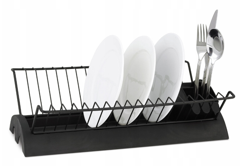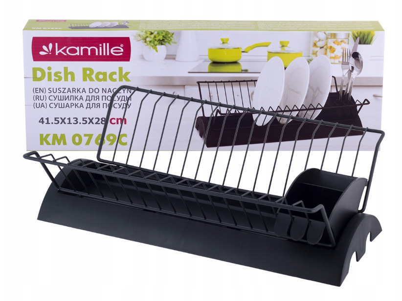 Trauku žāvētājs 41,5 x 11,5 x 25,5 cm, 0769C, KAMILLE. Moderns dizains. Izgatavots no nerūsējošā tērauda. Žāvētājs nav pakļauts rūsēšanai. Aprīkots ar plastmasas paplāti pilošā ūdens savākšanai. Papildus ir iekļauta noņemama galda piederumu notecināšanas paplāte, kas iekšpusē sadalīta divās daļās. Rūpīgi izgatavots, praktisks un izturīgs. Tas atvieglos ar rokām mazgātu galda piederumu un šķīvju žāvēšanu un pasargās jūsu virtuves virsmu. Komplektā ietilpst arī galda piederumu notecināšanas paplāte un pilienu savākšanas paplāte. Salocītā veidā tas aizņem maz vietas un izskatās ļoti eleganti. Izmēri: kopējais garums: 41,5 cm, kopējais augstums: 11,5 cm, kopējais platums: 25,5 cm.
