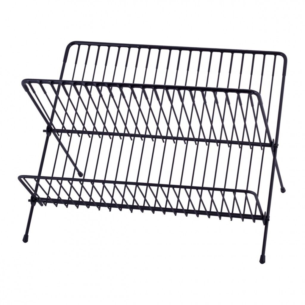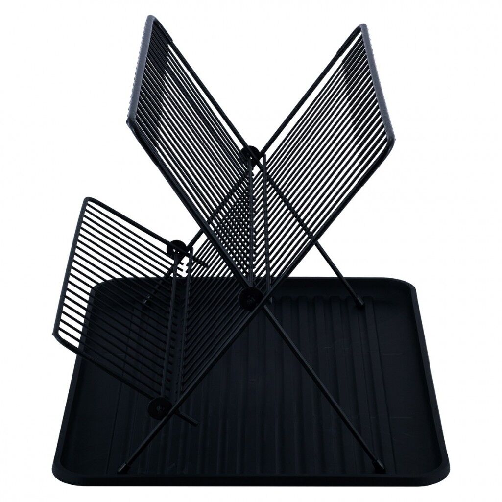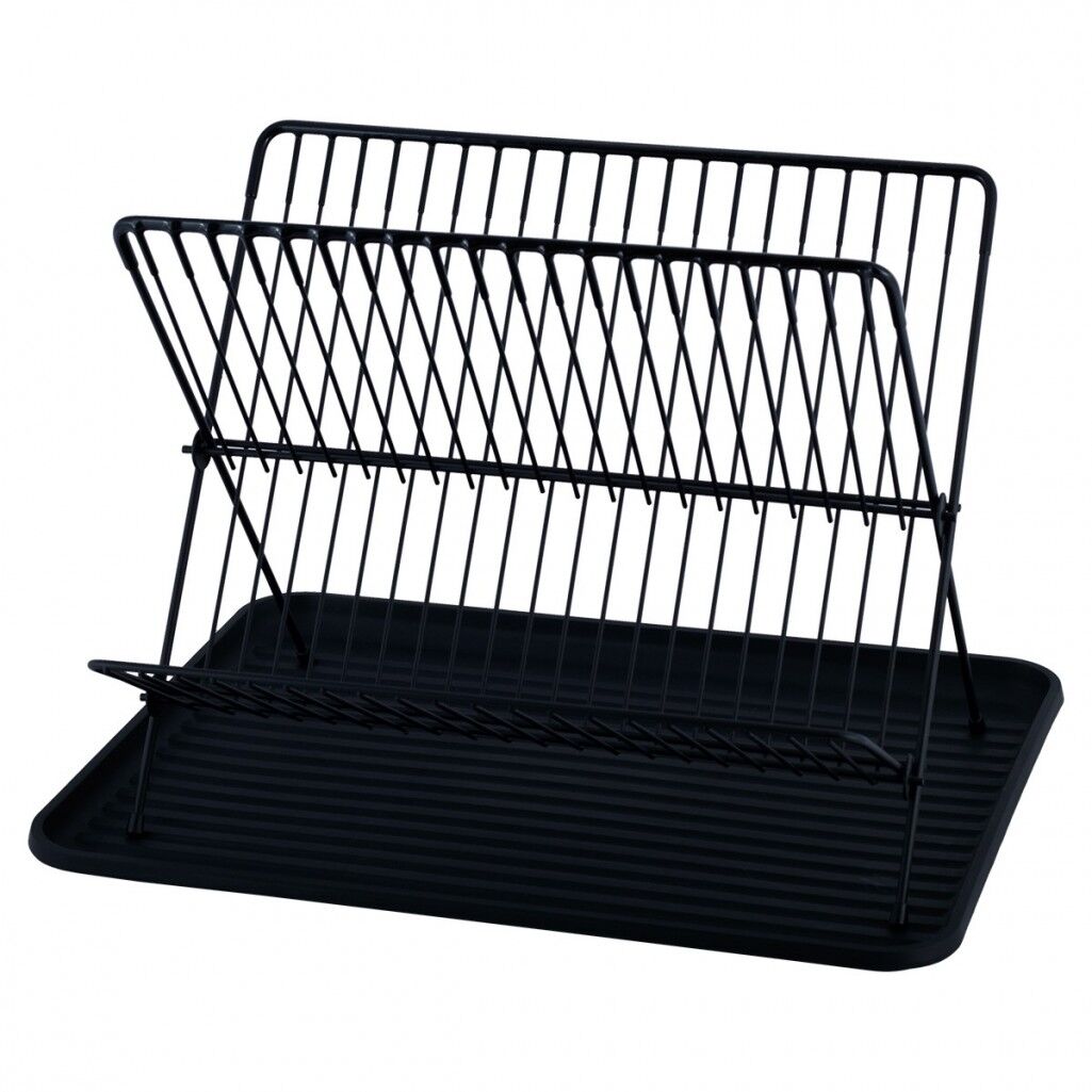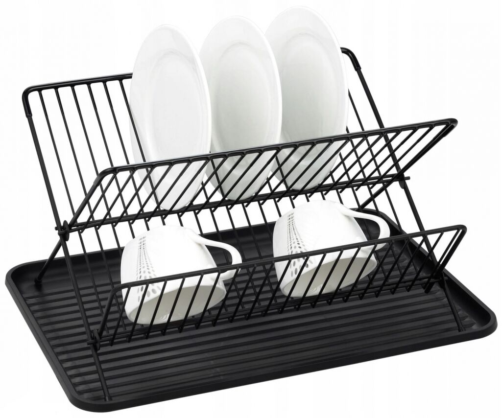 Trauku žāvētājs 43 × 32 × 25,5 cm, 0753, KAMILLE. Trauku žāvētājs ar paliktni, sānu galda piederumu turētāju un krūzīšu turētājiem. Izgatavots no alumīnija; paliktnis ir no plastmasas. Platums: 43 cm, dziļums: 32 cm, augstums: 25,5 cm. Pieejams melnā krāsā.