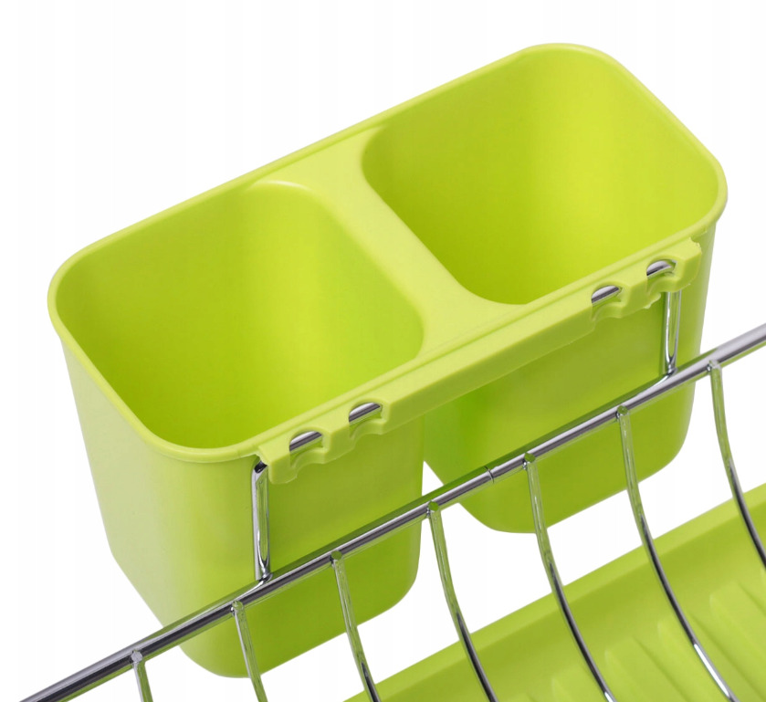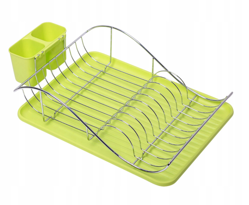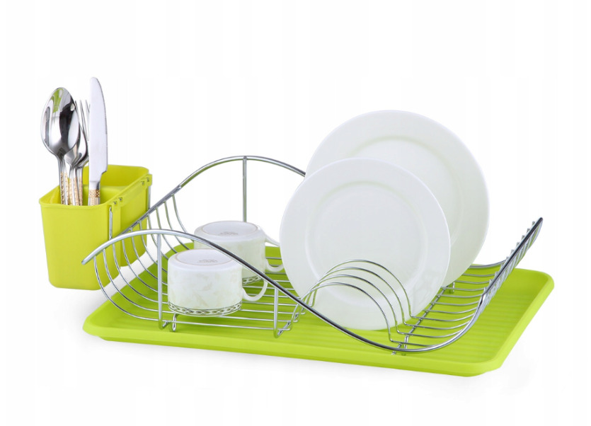 Trauku žāvētājs 49 × 32 × 12,5 cm (zaļš), 0761A, KAMILLE. Trauku žāvētājs ar paliktni un sānu galda piederumu turētāju. Izgatavots no hromēta tērauda; paliktnis un galda piederumu turētājs ir no plastmasas. Garums: 49 cm. Platums: 32 cm. Augstums: 12,5 cm. Pieejams zaļā krāsā.