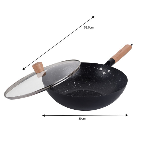 Woka panna ar vāku, melns marmors, Ø30 cm × augstums apm. 9 cm, KH 1984, Kinghoff. Izgatavota no augstas kvalitātes oglekļa tērauda ātrai uzkaršanai un vienmērīgai siltuma sadalei. Aprīkota ar marmora nelīpošo pārklājumu, kas ļauj cept ar minimālu tauku daudzumu un nodrošina vieglu tīrīšanu. Pannai ir ergonomisks koka rokturis drošam, karstumizturīgam satvērienam, kā arī stikla vāks ar tvaika atveri ideālai dārzeņu sautēšanai un gatavošanai. Lielais 30 cm diametrs ir piemērots ģimenes maltīšu pagatavošanai. Saderīga ar visām plītīm, tostarp indukcijas. Universāla lietošana: stir-fry, kariji, pasta, rīsi, dārzeņi, woks un tvaicēti ēdieni. Diametrs: 30 cm. Augstums: apm. 9 cm. Garums ar rokturi: apm. 53.5 cm. Materiāls: oglekļa tērauds. Pārklājums: marmora, nelīpošs. Vāks: rūdīts stikls ar tvaika atveri un koka rokturi. Roktura materiāls: koks, ergonomisks. Saderība: indukcijas, gāzes, elektriskās, keramikas un halogēna plītis. Ieteicams mazgāt ar rokām.