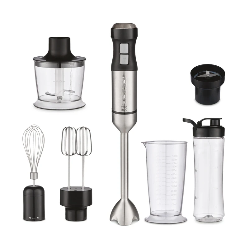 Zelmer ZHB4753 VARIO rokas blenderis ir daudzpusīga 1800 W ierīce ar 20 ātruma pakāpju kontroli un 4 titāna asmeņu QUATTROMIX PRO sistēmu.