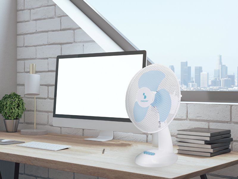 Galda ventilators ar 3 lāpstiņām un tērauda aizsargrežģi, kura diametrs ir 30 cm.