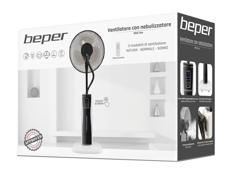 Ventilators ar modernu un praktisku dizainu. Šis ventilators ir ideāli piemērots svaiguma nodrošināšanai visās mājsaimniecības vidēs, pateicoties digitālajam vadības panelim ar izsmidzināšanas funkciju, 3 darbības režīmiem (parasts, vējš un nakts) un 3 izvēlētajiem ātrumiem. Ar taimeri līdz 12 stundām, programmējams arī no komplektā esošās ērtās tālvadības pults. Automātiska horizontāla šūpošanās un integrēta 2 litru ūdens tvertne. Komplektācijā iekļautie ritentiņi ļauj to pārvietot un novietot jebkurā telpas stūrī.