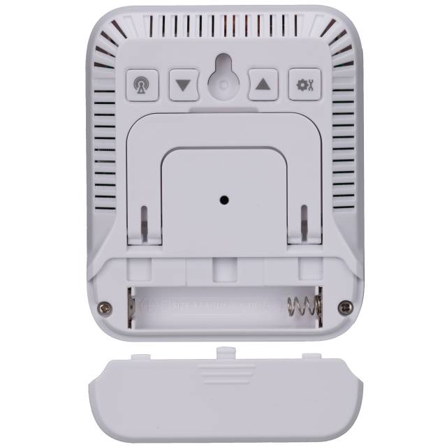 IESPĒJAS 3x termometri un higrometri vienā ierīcē Krāsains iekštelpu klimata komforta indikators Iekštelpu temperatūra (°C/°F) Relatīvais mitrums (iekštelpās, %) Laiks pēc DCF laika signāla (12 vai 24 stundu displejs) Laika nobīdes funkcija Datums Nepieciešamās baterijas: 3x AAA (nav iekļautas) Stiprinājuma veids: statīvs, sienas stiprinājums un magnēts