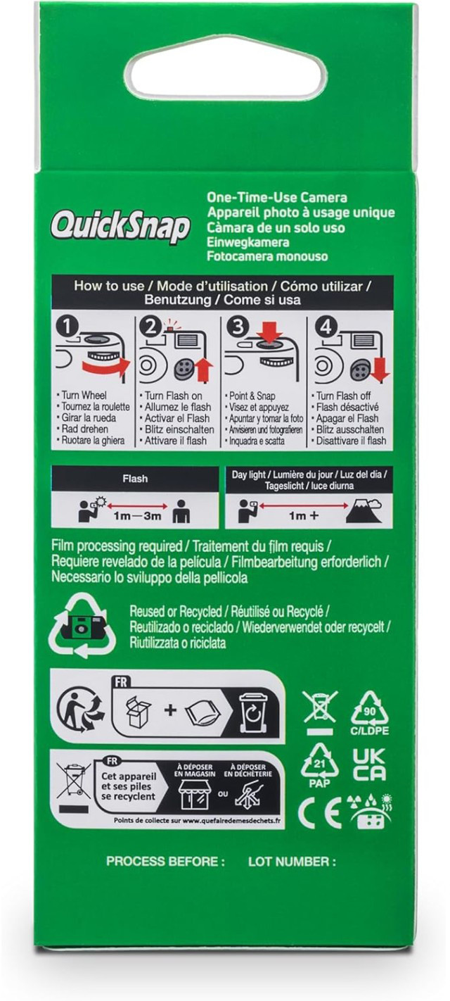 Our QuickSnap™ single-use film camera comes in at only 90 grams, making it half the weight of your average smartphone. And being super compact, it's easy to pop in your pocket and take with you, wherever you go!