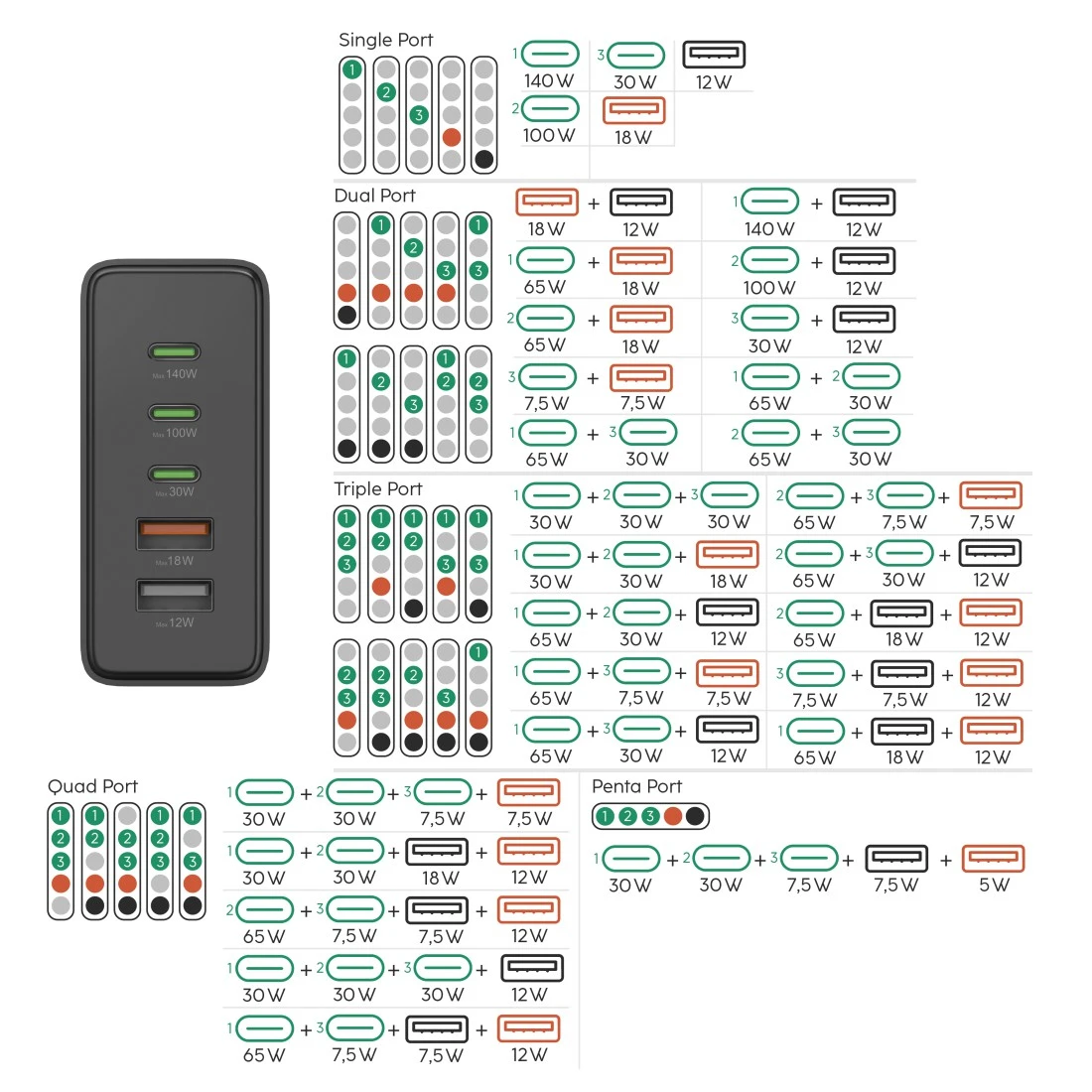 Maksimālā izejas jauda: 140 vati - universāls lādētājs mobilo tālruņu vai citu ierīču ātrai uzlādēšanai, izmantojot USB-A un USB-C saskarni.