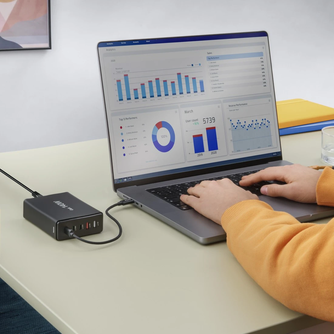 Vairāku USB uzlādes stacija ar piecām pieslēgvietām un īpaši augstu veiktspēju: trīs ligzdas 5-in-1 uzlādes stacijā piedāvā ātrās uzlādes tehnoloģiju ar Power Delivery, izmantojot USB-C, savukārt divas USB-A pieslēgvietas atbalsta Qualcomm® Quick Charge™ 3.0 - tāpēc viedtālruņus, klēpjdatorus, planšetdatorus, austiņas, viedpulksteņus, barošanas blokus utt. var uzlādēt ar maksimālu ātrumu, izmantojot ligzdu.
